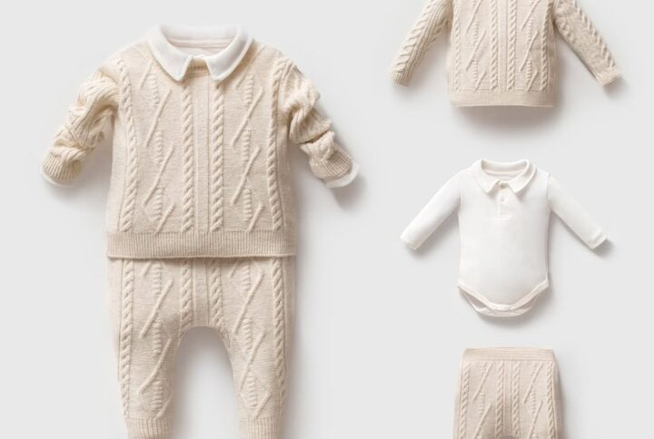 This elegant 3 pcs burgundy knitted baby set is the perfect blend of comfort and style for your little one. It includes a soft knit cardigan with matching salopette featuring delicate ruffle hems with charming knit details, and a white cotton bodysuit with a Peter Pan collar for a refined touch. Made from gentle fabrics to keep your baby cozy all day long — ideal for both everyday wear and special occasions.