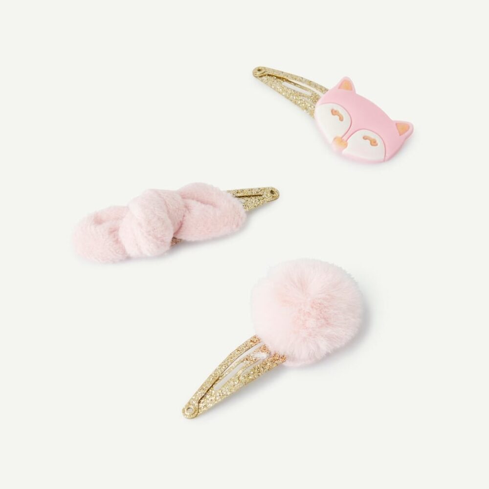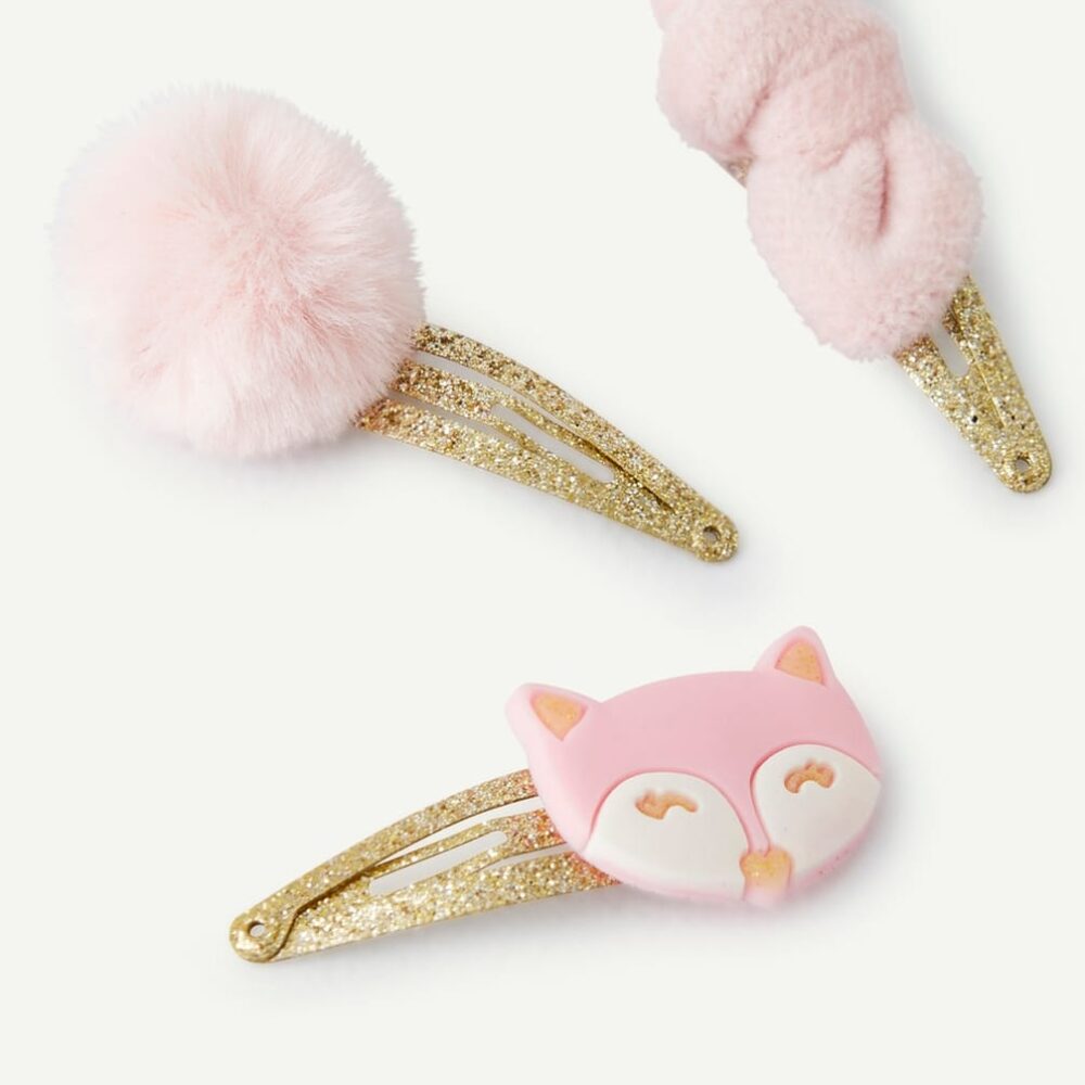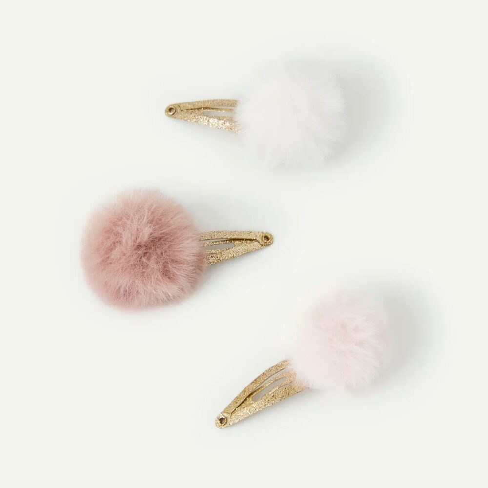 Set of three baby girls’ glitter hair clips with pompoms