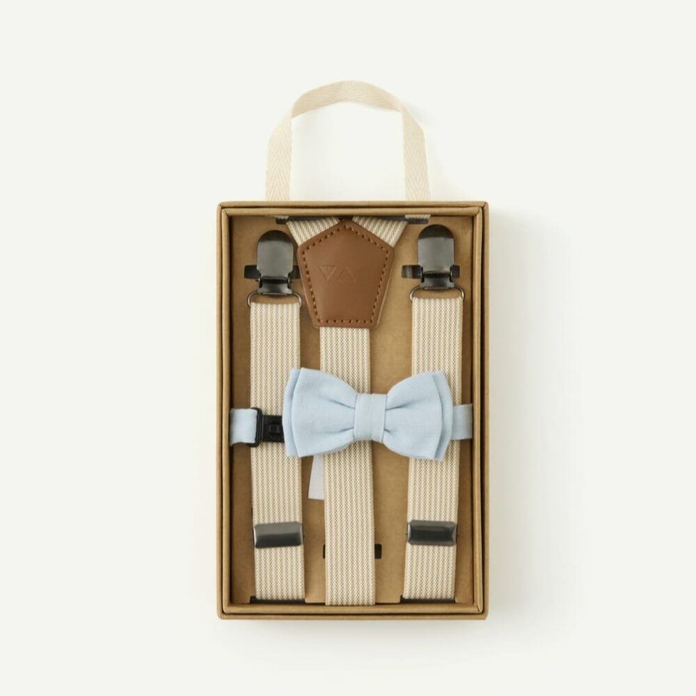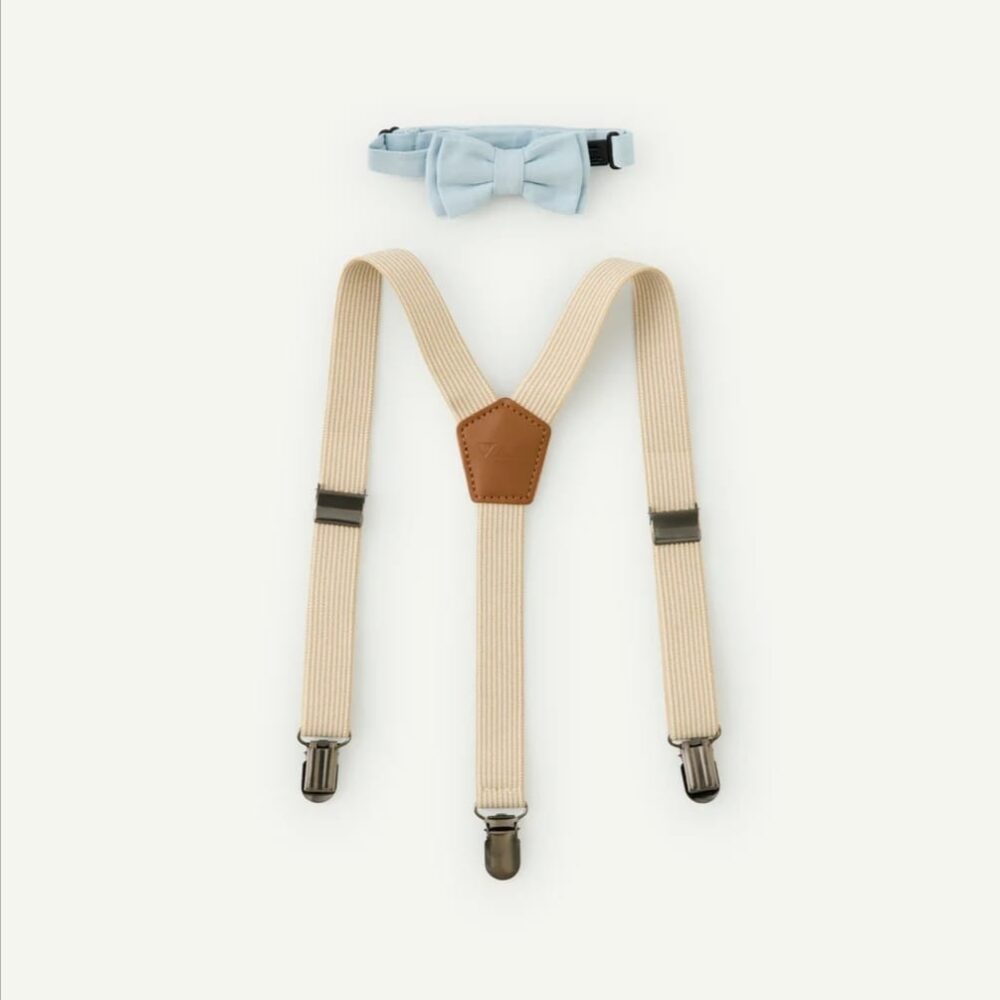 Beige suspenders with blue bow