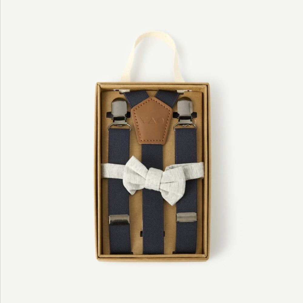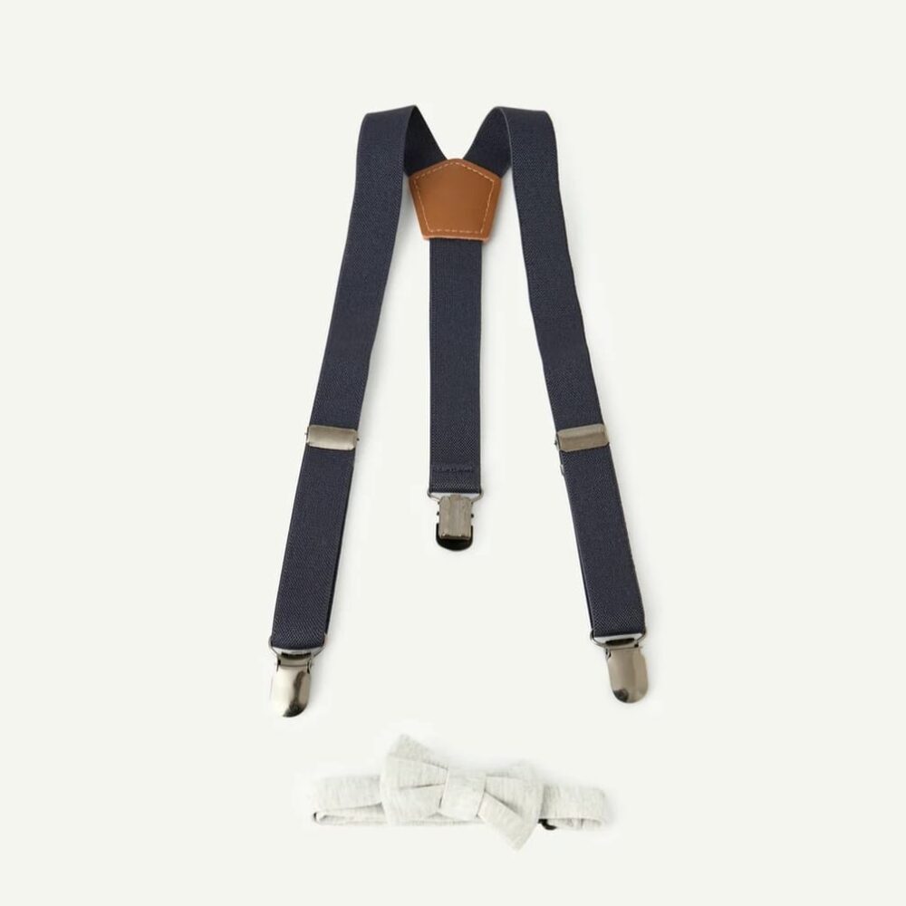 Navy blue suspenders with gray bow