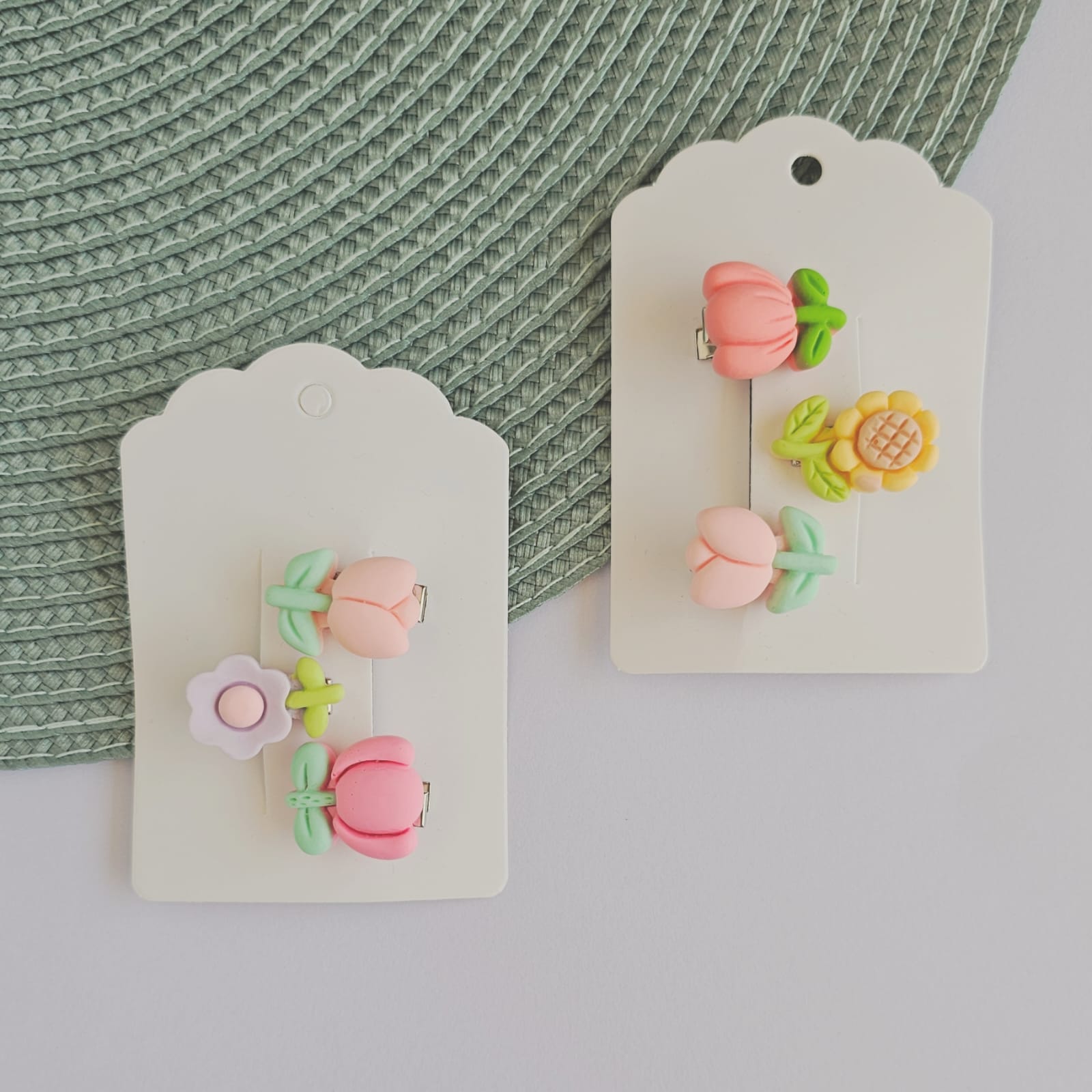 A set of adorable flower-shaped hair clips crafted from soft, colorful rubber. Each clip features a different bloom design — tulip, sunflower, daisy, and rose — with pastel tones of coral pink, peach, lilac, and sunny yellow. The back is secured with a sturdy metal clasp to avoid falling from your baby hair, making them easy to wear and comfortable for little ones. Perfect for adding a sweet and playful touch to everyday outfits, party looks, or gift sets.