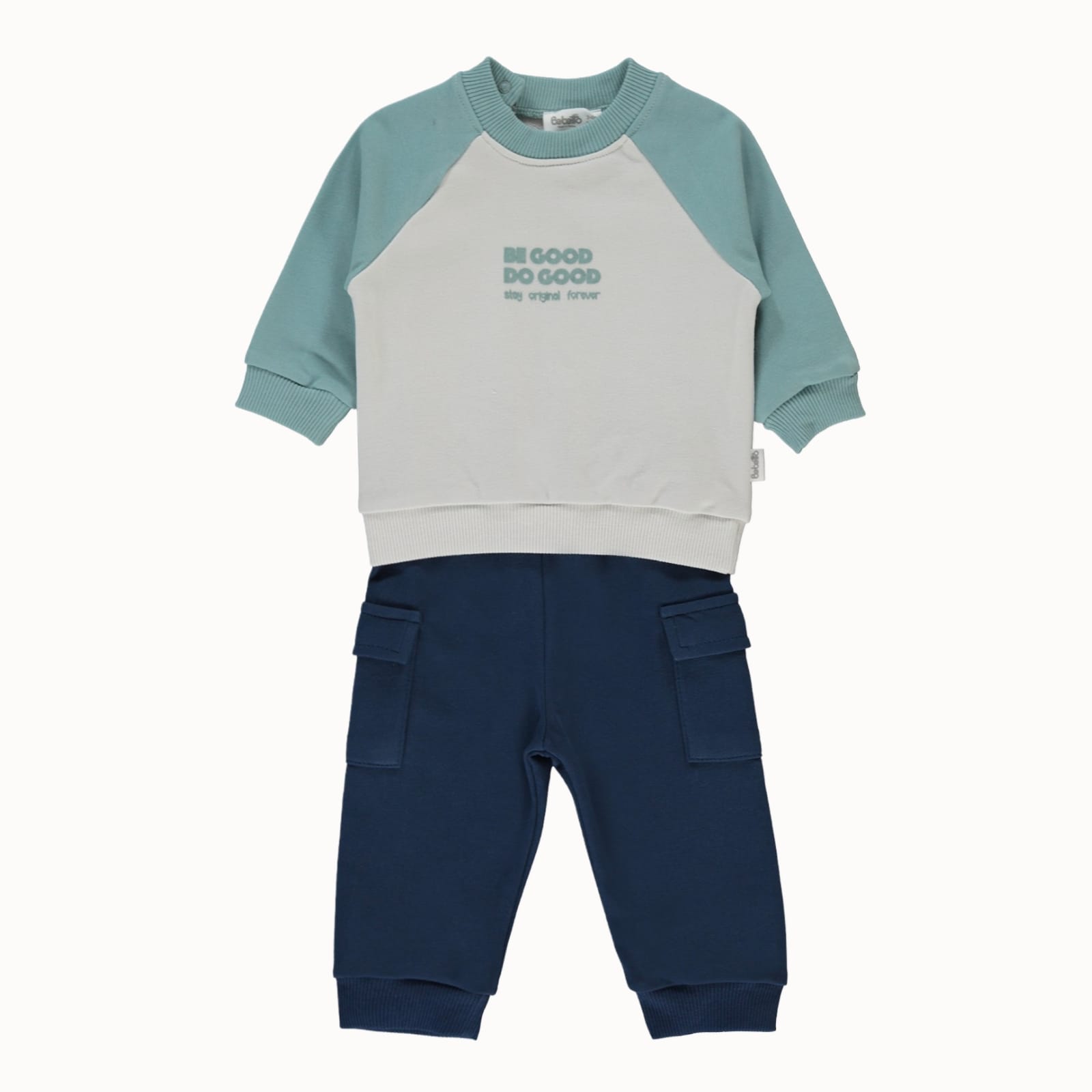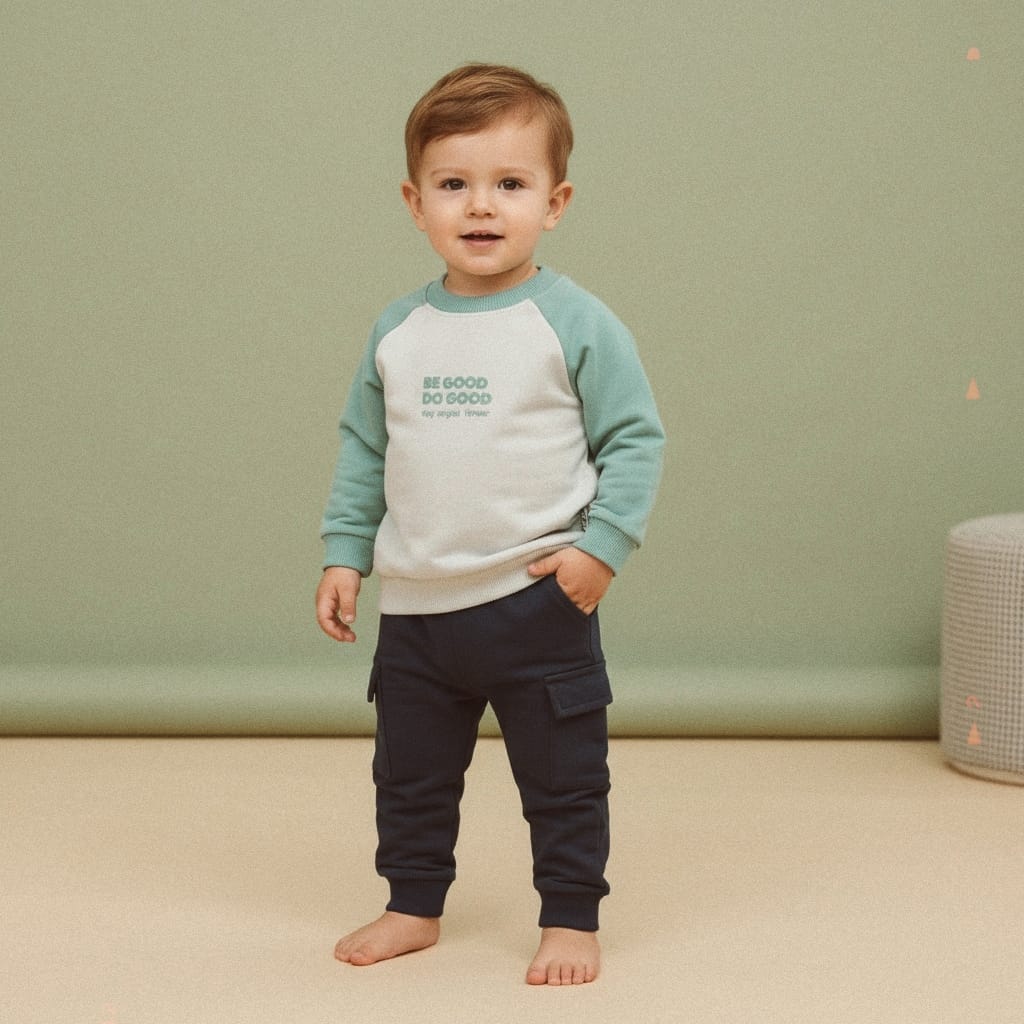 A trendy and comfy 2-piece outfit for boys. The colorblock sweatshirt features mint sleeves with a greige body and an inspiring slogan print “Be Good, Do Good, Stay Original Forever.” Paired with navy blue cargo pants designed with side pockets and ribbed hems, this set is perfect for active days, playtime, or casual outings in style.