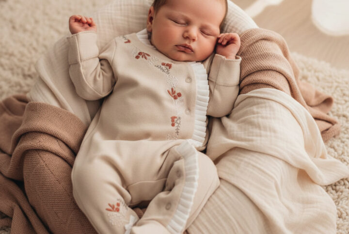 Blush Beige Ruffle-Trimmed Baby Sleepsuit with Floral Embroidery