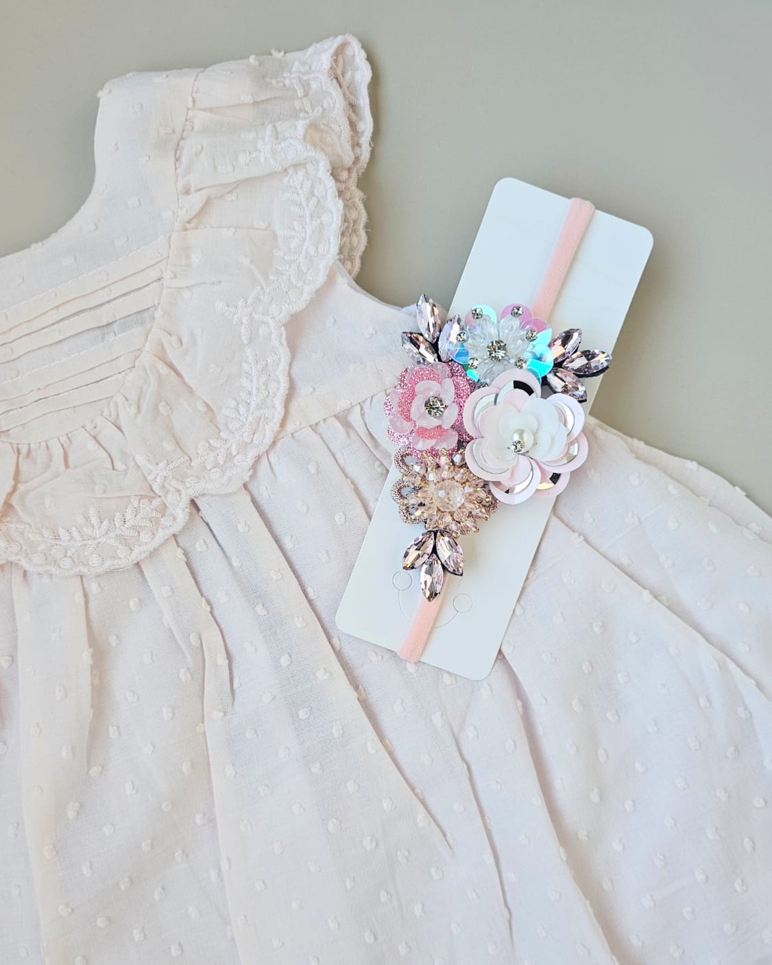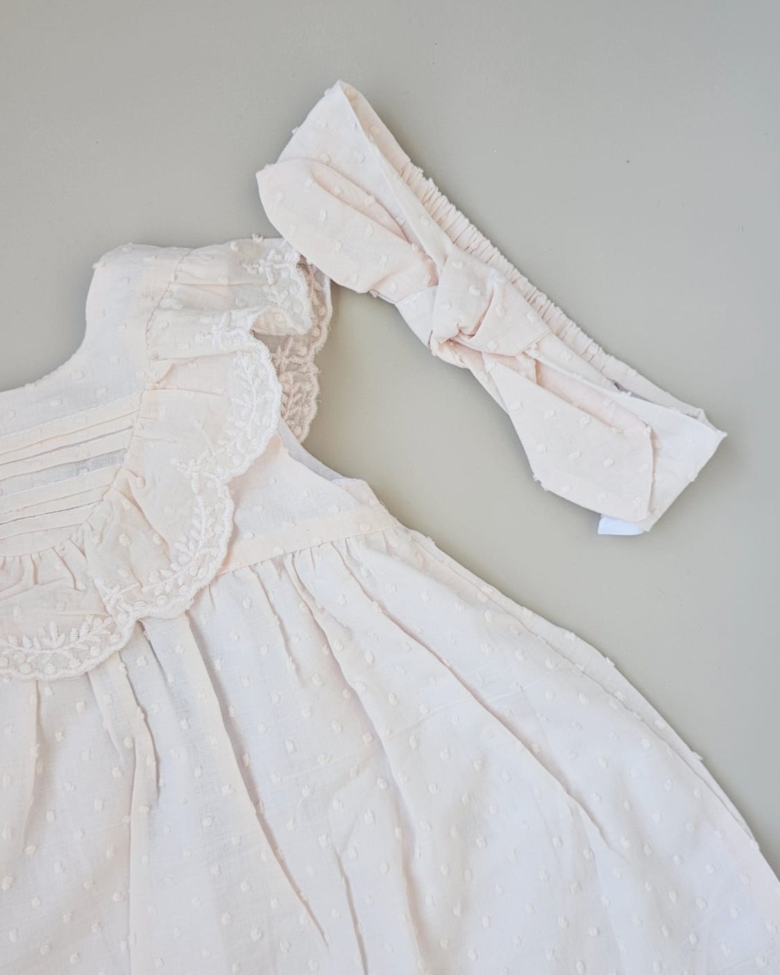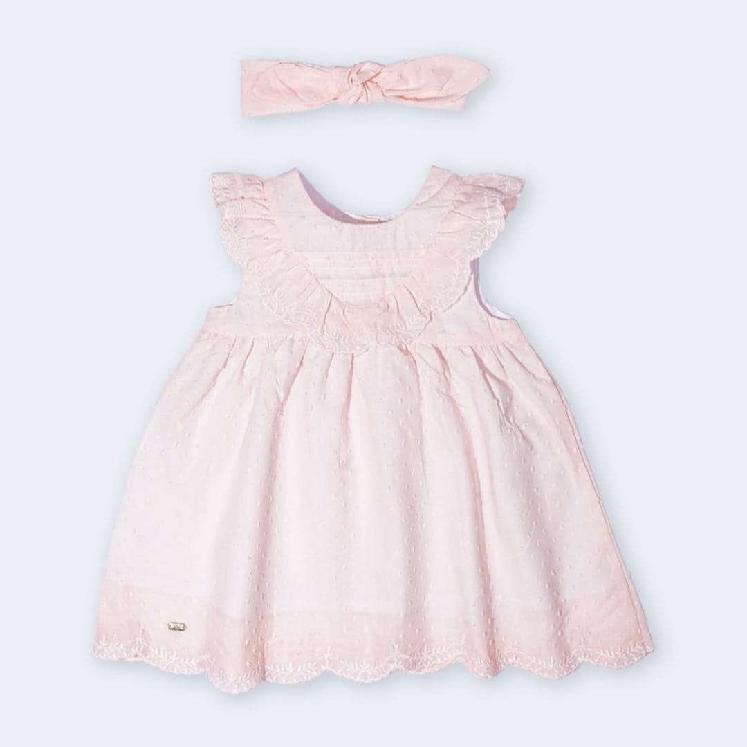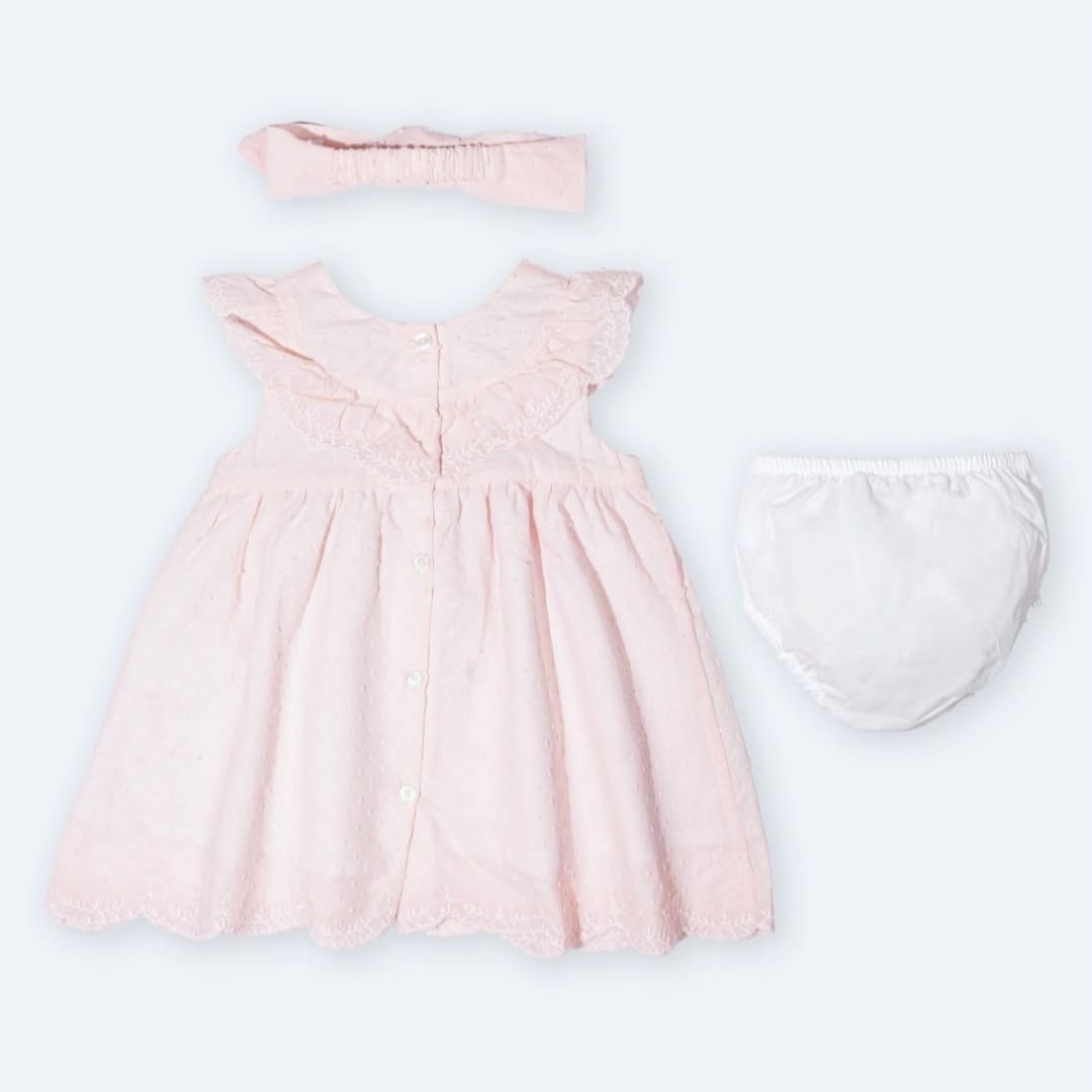 An elegant 3-piece baby girl set including a soft blush pink sleeveless dress with delicate lace details, a matching bow headband, and white bloomers. Designed with comfort and charm in mind—ideal for special occasions or sweet everyday moments.