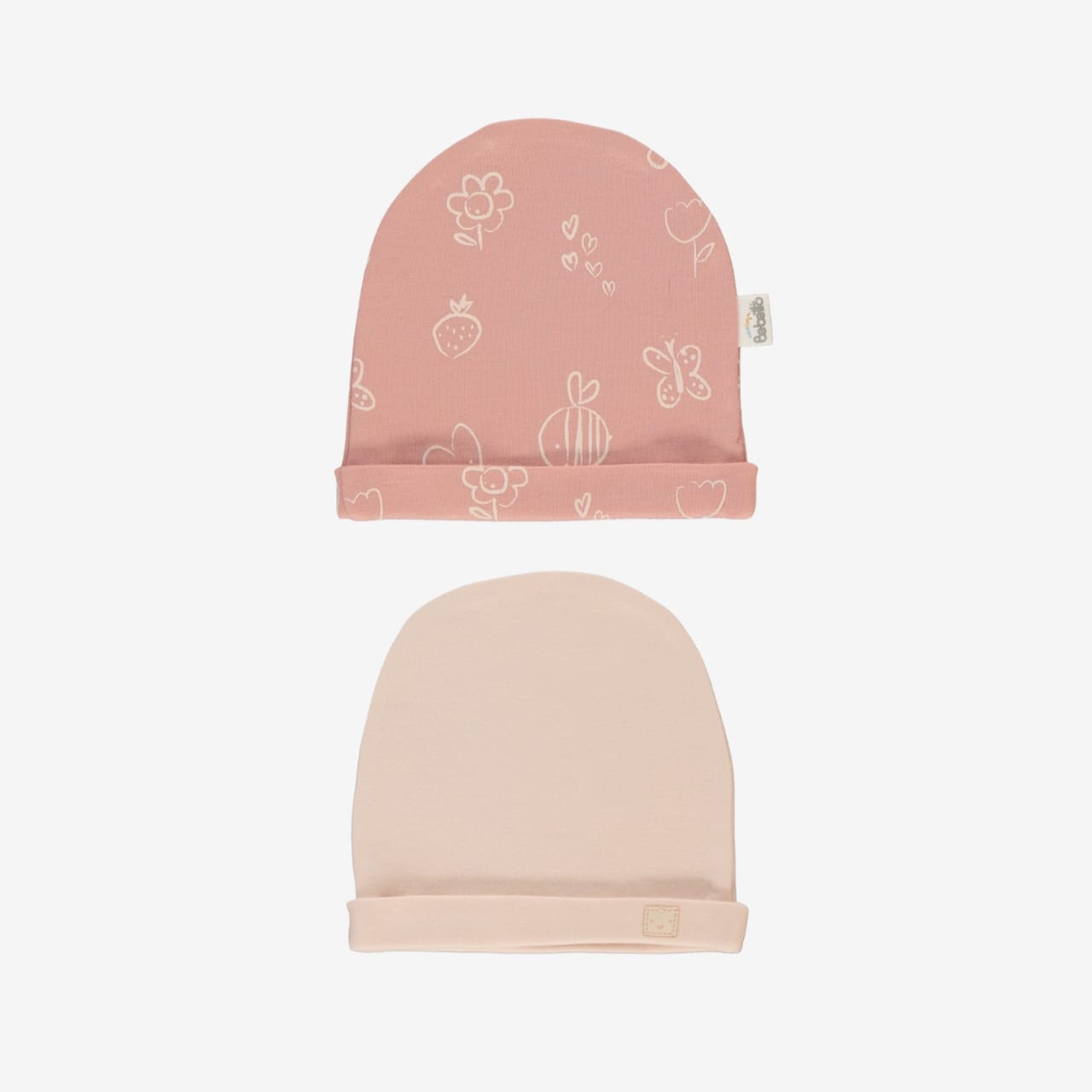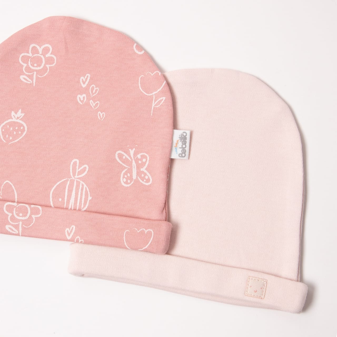A cozy duo of cotton hats designed to keep your little one snug and stylish from day one. The set includes a playful pink hat with sweet doodle prints and a soft plain blush hat for everyday wear. Made from breathable, gentle cotton—perfect for sensitive newborn skin.