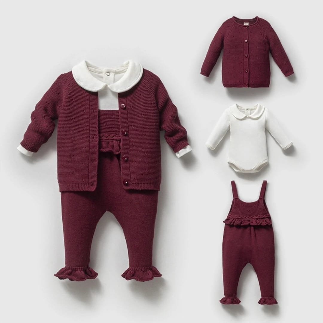 This elegant 3 pcs burgundy knitted baby set is the perfect blend of comfort and style for your little one. It includes a soft knit cardigan with matching salopette featuring delicate ruffle hems with charming knit details, and a white cotton bodysuit with a Peter Pan collar for a refined touch. Made from gentle fabrics to keep your baby cozy all day long — ideal for both everyday wear and special occasions.