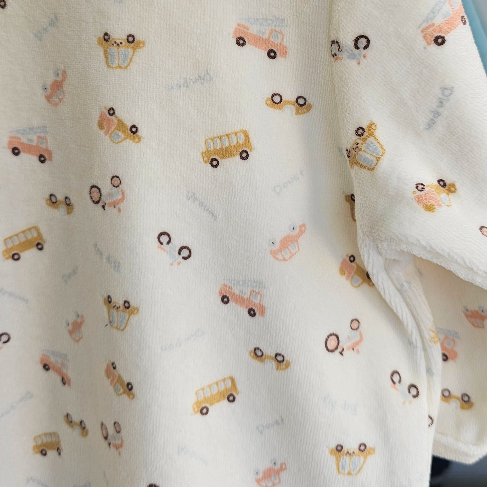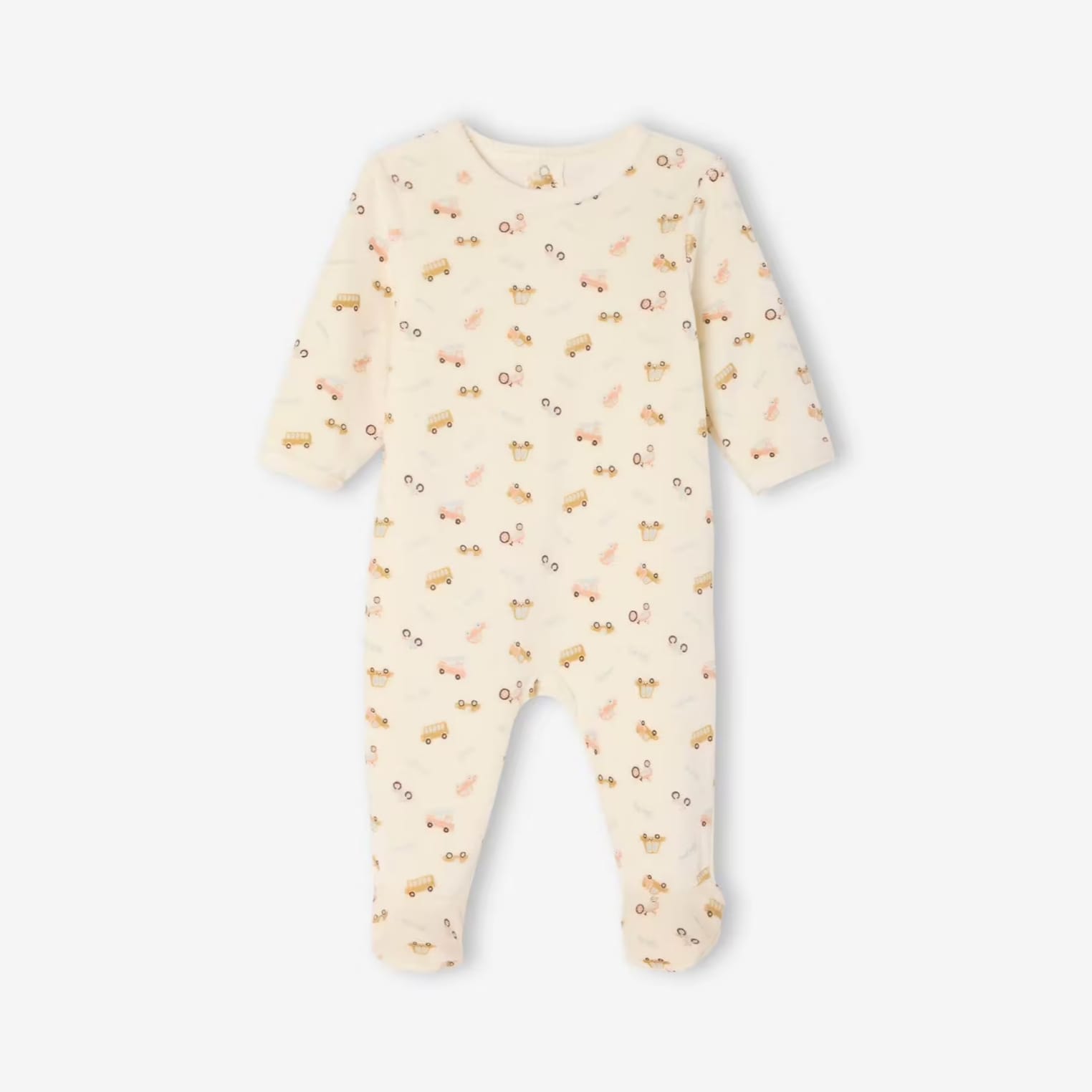 A soft cream baby french velour sleepsuit with playful all-over prints of cars, crowns, and whimsical motifs in warm pastel shades. Designed with long sleeves and built-in footies with non slip base for big sizes (6 months+), it keeps your little one cozy and covered from head to toe. Made from gentle, breathable fabric, this one-piece is perfect for everyday comfort, naps, or outings, while adding a fun and charming touch to baby’s wardrobe.