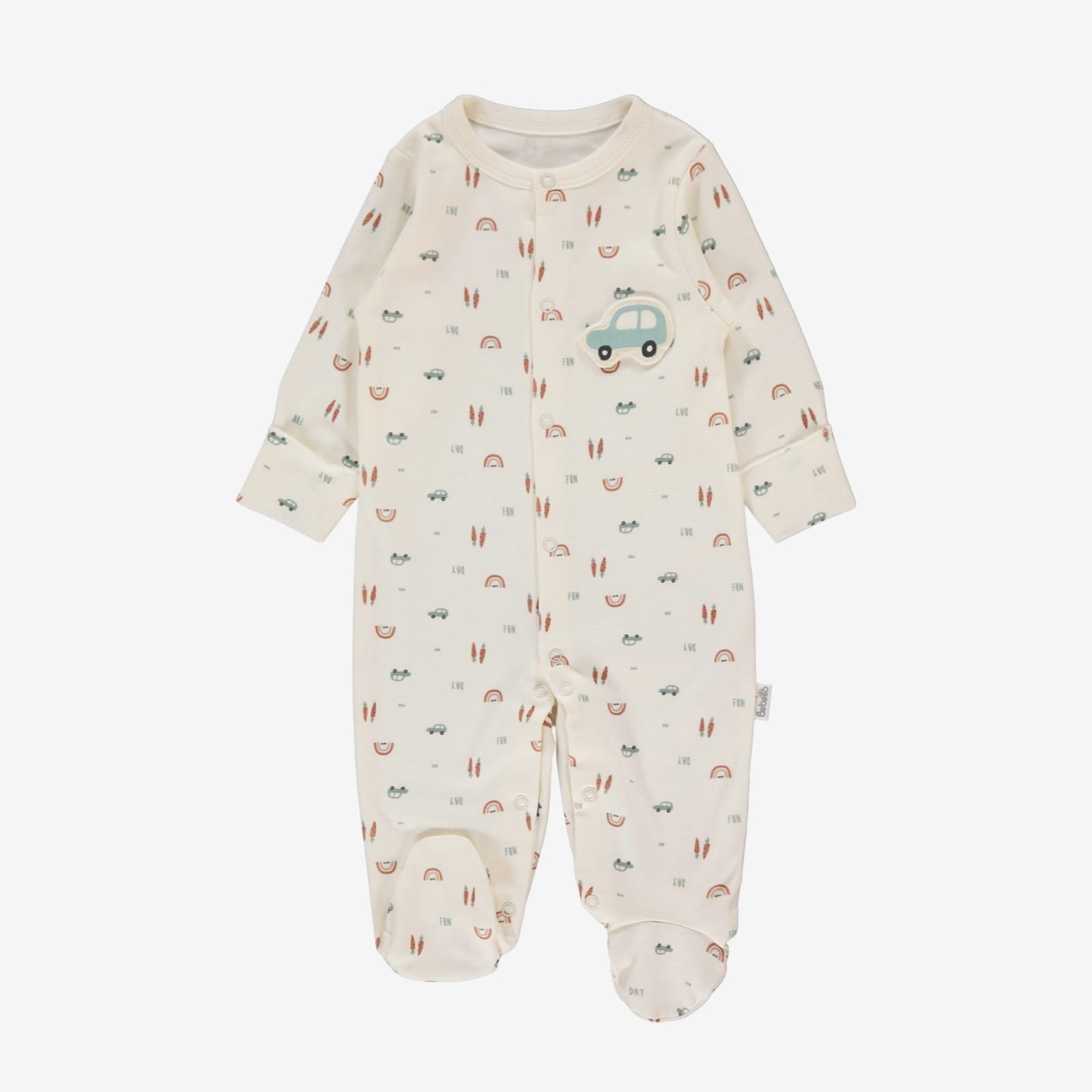 Made from soft, breathable cotton, this sleepsuit is designed to keep your little one cozy all day and night. Decorated with playful rainbow and car prints, it features a sweet stitched car patch for added charm. With built-in mittens, easy snap closures and covered feet, it’s a practical yet adorable essential for every baby’s wardrobe.