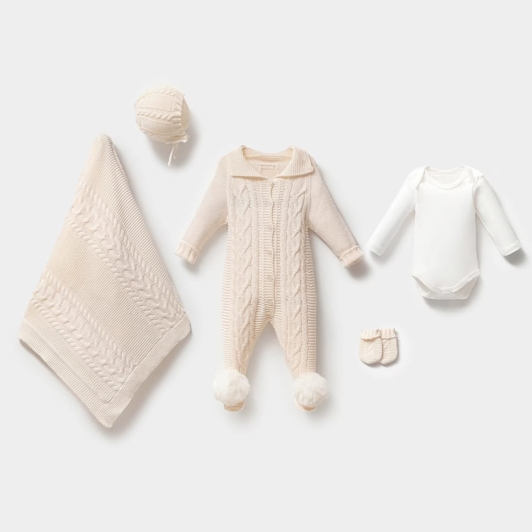 A timeless and elegant 5-piece knitted baby set crafted in soft cream tones, perfect for newborns. The set includes a cable-knit jumpsuit with removable fluffy pom-pom details, matching bonnet, mittens, and a cozy blanket — all paired with a white cotton bodysuit for extra comfort. Designed to keep your little one warm and stylish, this set makes an ideal gift for baby showers or special occasions.