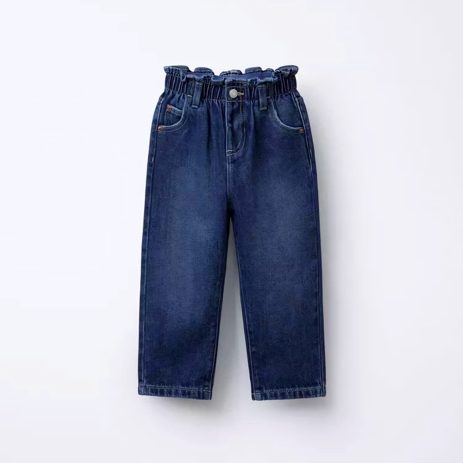 These stylish dark denim pants feature a relaxed straight-leg cut and a trendy paperbag waist with gentle ruffle detailing and heart shaped pockets. Designed with a comfortable elastic waistband and classic five-pocket style, they combine practicality with a modern look. The denim shades make them easy to pair with any top, perfect for both casual outings and everyday wear.