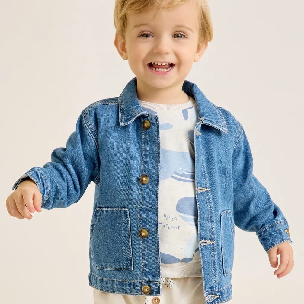 A french denim jacket ,designed with a relaxed fit for everyday comfort. It features a button-down front, two patch pockets, and sturdy stitching for durability. The soft yet durable denim makes it perfect for layering in any season, giving little ones a stylish and practical look.