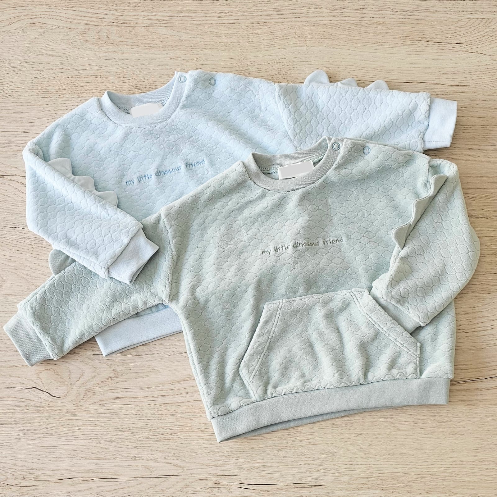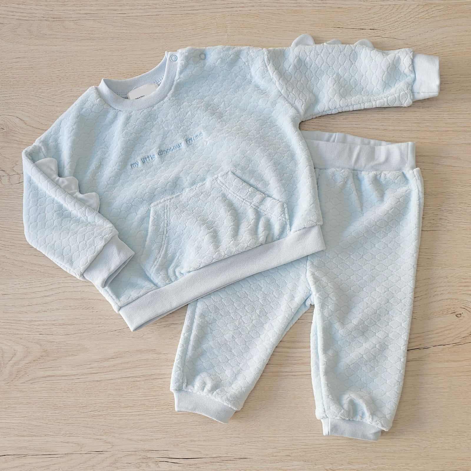 This adorable two-piece velour set in soft powder blue is perfect for keeping your little one cozy and stylish. The top features a round neckline, side ruffle detail, and a cute front pocket, with delicate embroidery reading “my little dinosaur friend.” The matching pants come with an elastic waistband and ankle cuffs for a snug, comfortable fit.