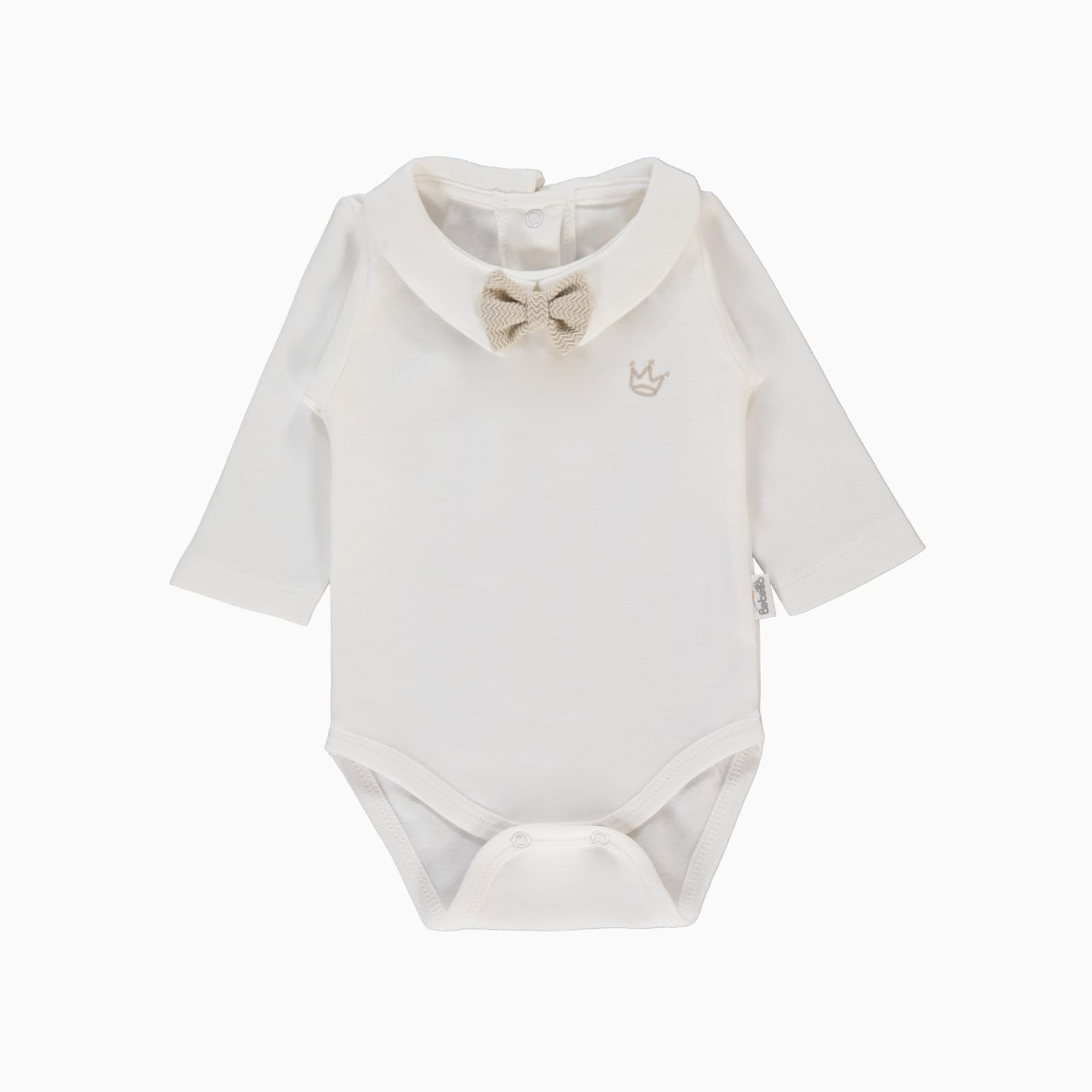 A refined and charming piece for your little one, this white long-sleeve bodysuit features a soft collar and an adorable textured beige bow tie for a touch of elegance. The delicate embroidered crown detail adds a royal finish, making it perfect for special occasions or stylish everyday wear. Crafted from soft, breathable fabric, it ensures comfort while keeping your baby looking effortlessly cute.