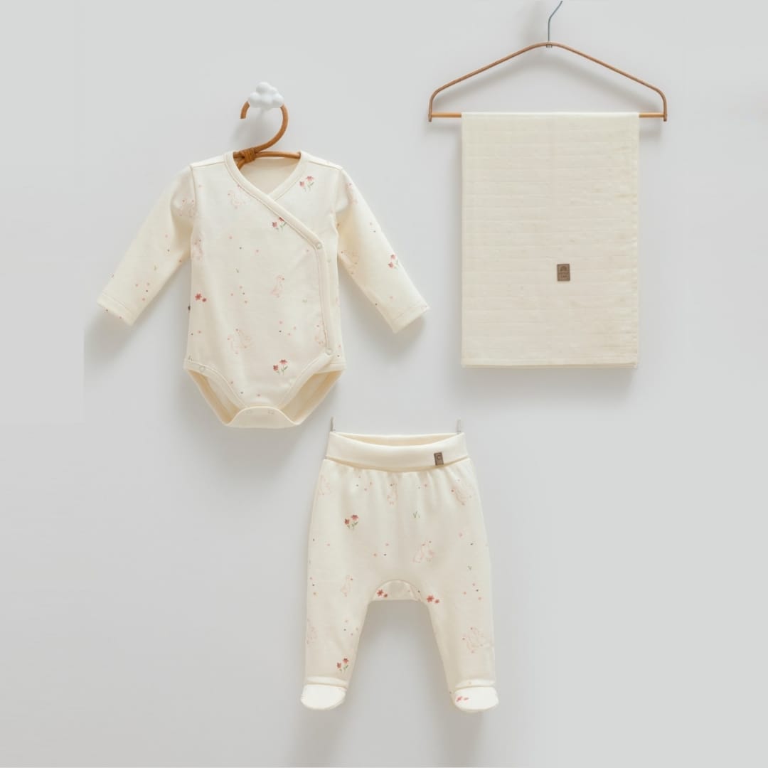This adorable 3-piece baby set includes a long-sleeve wrap bodysuit, comfy footed high waist pants, and a muslin blanket. Made from ultra-soft midseason cotton, it ensures your baby’s comfort all day long.