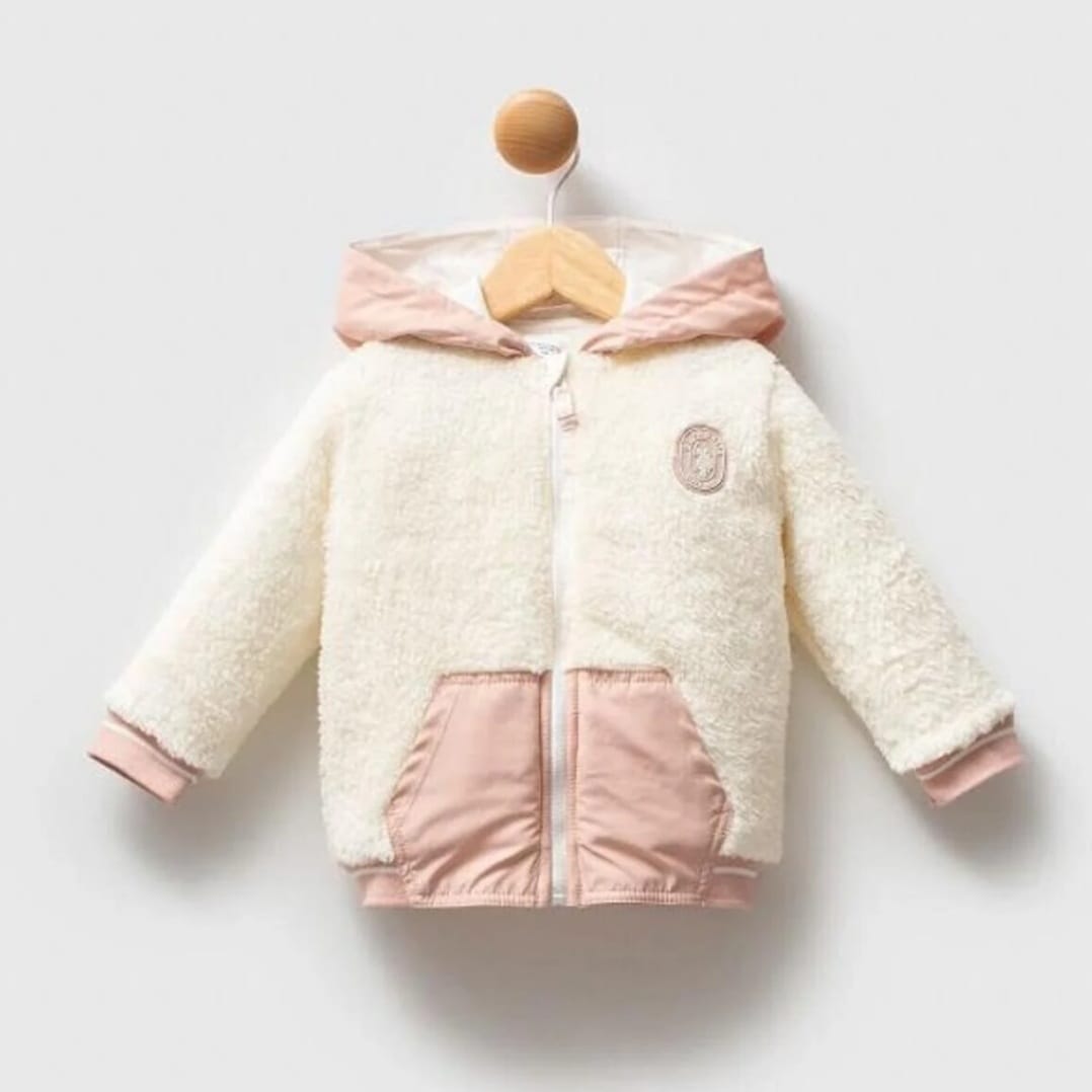 Wrap your little one in warmth and style with this adorable teddy jacket. Featuring a fluffy cream sherpa body and contrasting waterproof blush pink details on the hood, cuffs, and pockets, this piece blends comfort with charm. Designed with a front zipper for easy wear and a soft fur from both sides to keep your baby cozy on chilly days. Perfect for outings, playdates, or everyday wear during fall and winter.