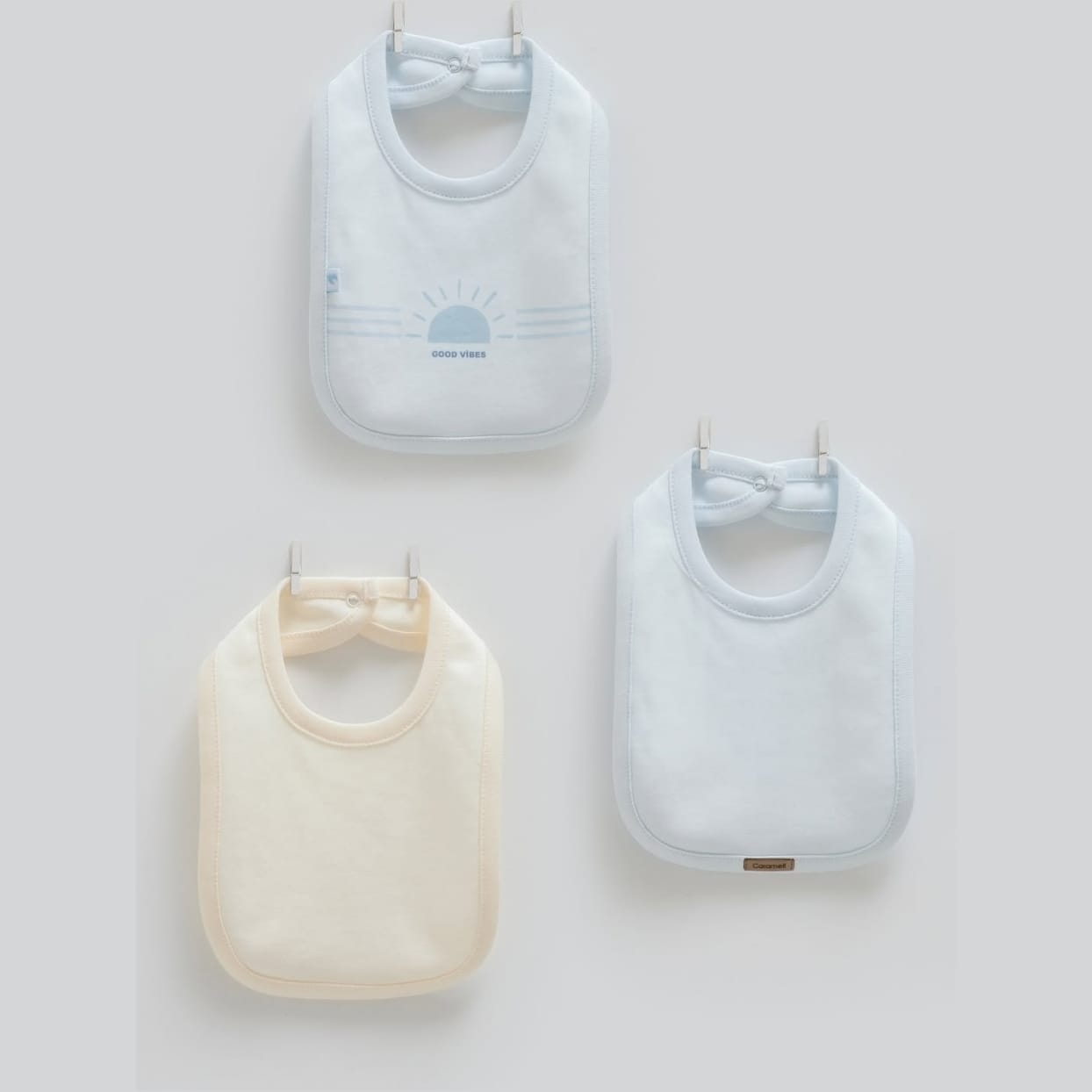 Keep your little one clean and comfy with this adorable set of 3 baby bibs. Made from soft, absorbent cotton, these bibs are gentle on delicate skin and perfect for everyday use. The set includes two pastel blue bibs — one with a “Good Vibes” sunrise print — and one in a soft cream tone. Designed with an easy snap closure at the back for quick changes, these bibs combine practicality with a sweet, minimalist look ideal for both boys and girls.