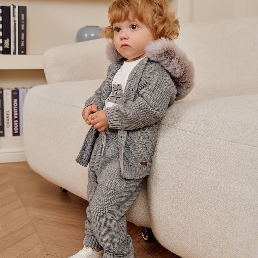 Keep your little one warm and stylish with this elegant 3-piece knitted winter set. The outfit features a knitted grey cardigan with a luxurious removable faux fur hood, matching knit pants with a comfy elastic waistband, and a white inner top for a complete look. Made from premium thick cotton yarn, it provides warmth without compromising comfort. The quilted knit pattern adds a touch of sophistication, making it perfect for chilly days or special winter outings. A must-have cozy outfit for your baby’s wardrobe!