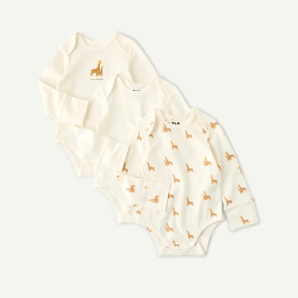 A practical and stylish set of three long-sleeve bodysuits crafted in France from soft, breathable cotton. Designed with an adjustable length to comfortably fit two sizes in one, these bodysuits grow with your baby. The set includes a plain piece, a sweet giraffe print, and a fun all-over giraffe pattern—perfect for everyday wear.