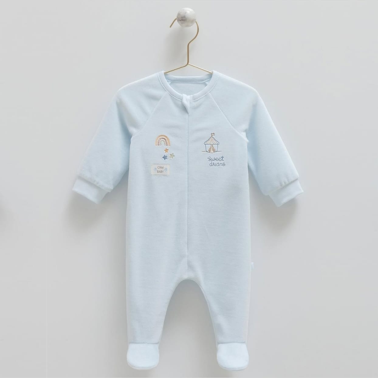 Wrap your little one in comfort with this adorable light blue baby sleepsuit. Crafted from soft, comfy velour, it keeps your baby cozy and gentle on sensitive skin. The front features delicate embroidered details — a rainbow, stars, and a “Sweet Dreams” message — adding a sweet and peaceful touch to bedtime. Designed with a zipper all over it for easy dressing and diaper changes, and built-in footies to keep tiny toes warm, this sleepsuit is perfect for peaceful naps and dreamy nights.