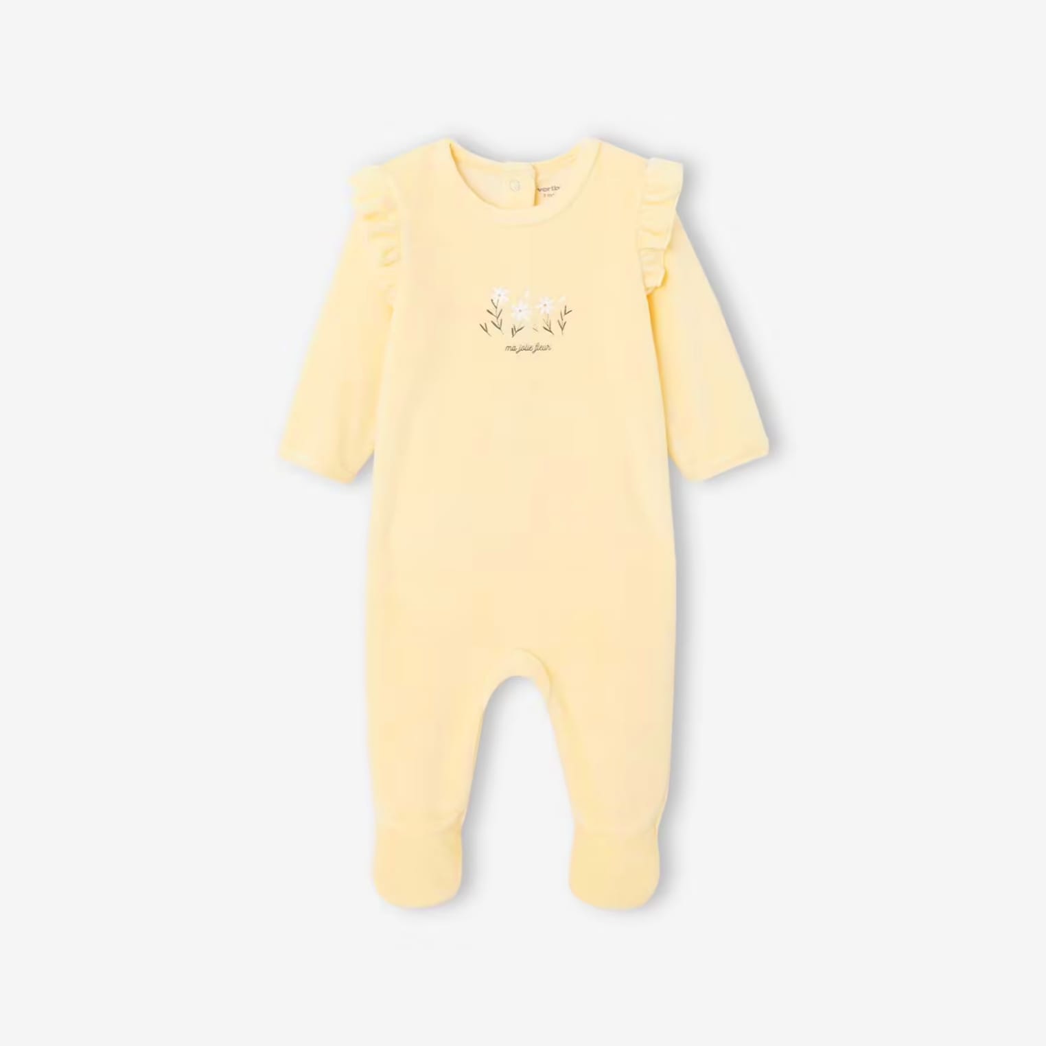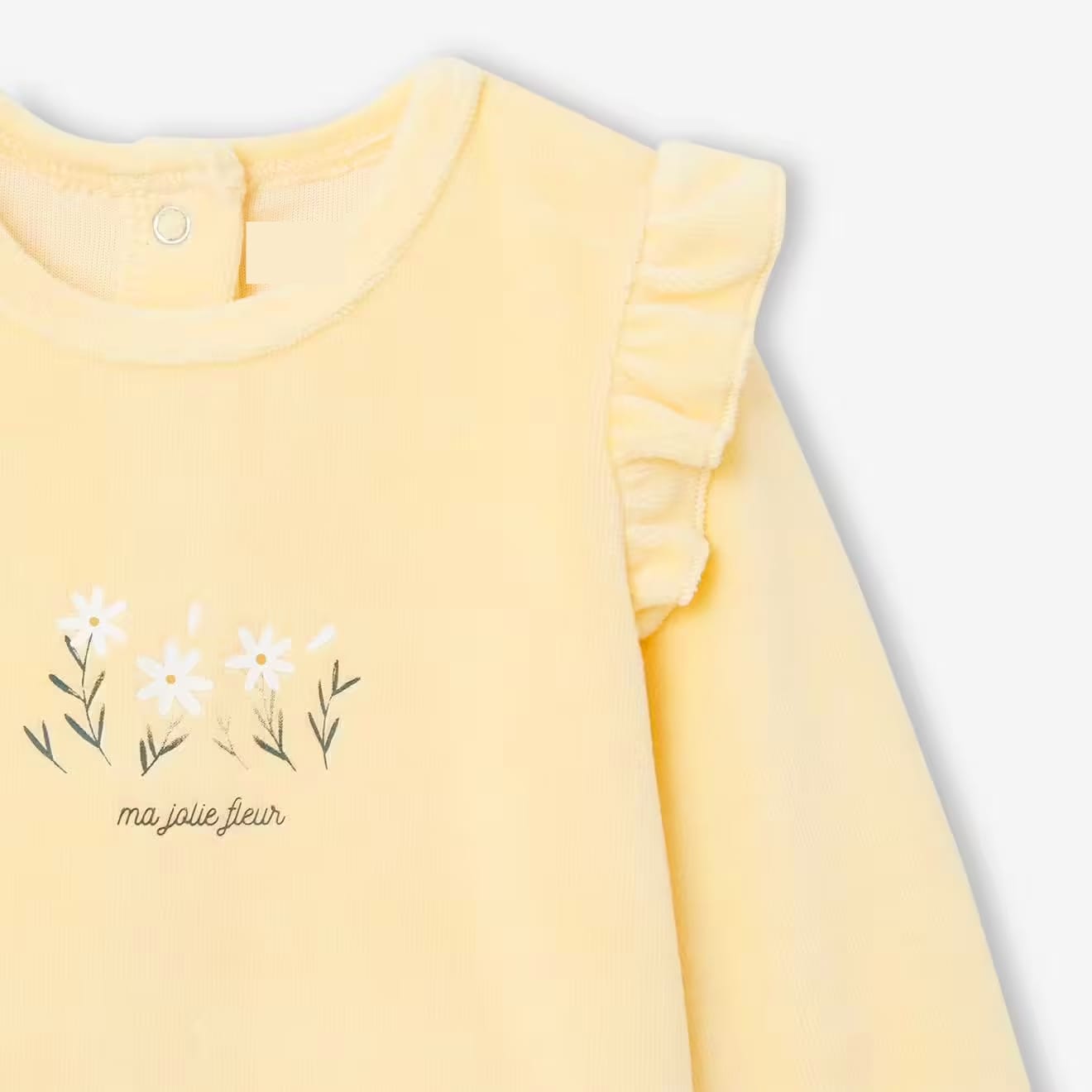 A delightful pastel yellow baby sleepsuit made of french velour featuring soft ruffle details on the shoulders and a delicate floral print at the chest with the words “ma jolie fleur”. Made from gentle french velour fabric, this one-piece ensures maximum comfort while keeping your little one cozy from head to toe. Complete with long sleeves and covered feet with non slip base for big sizes, it’s the perfect mix of sweetness and practicality for everyday wear or as a thoughtful gift.