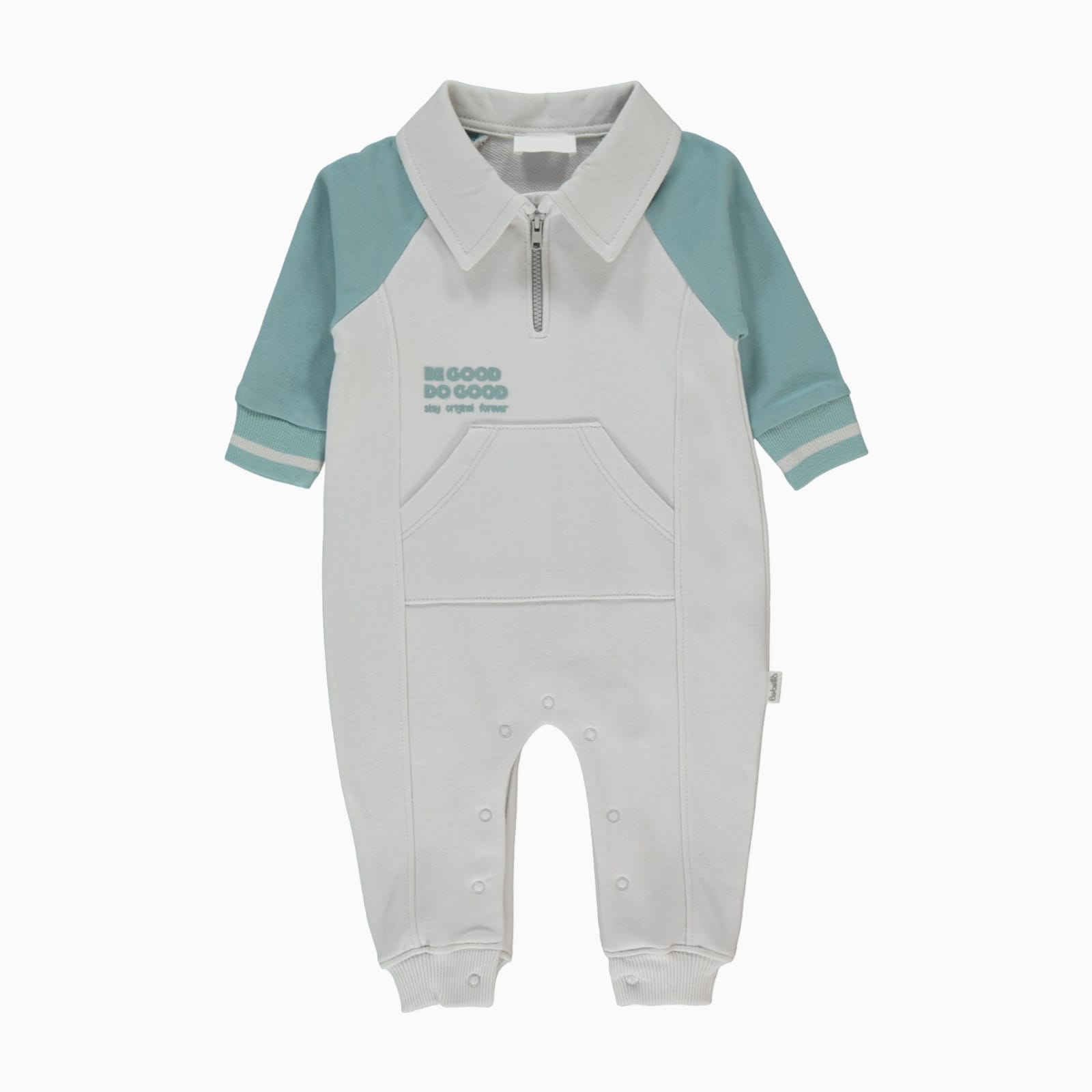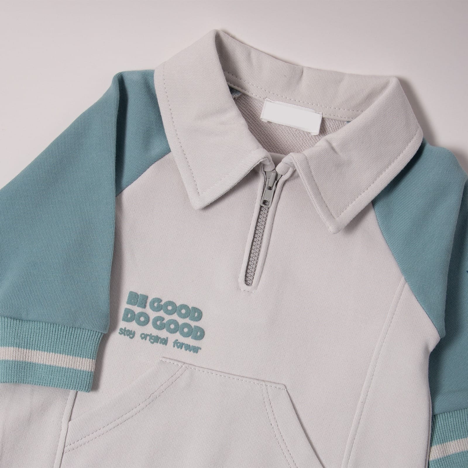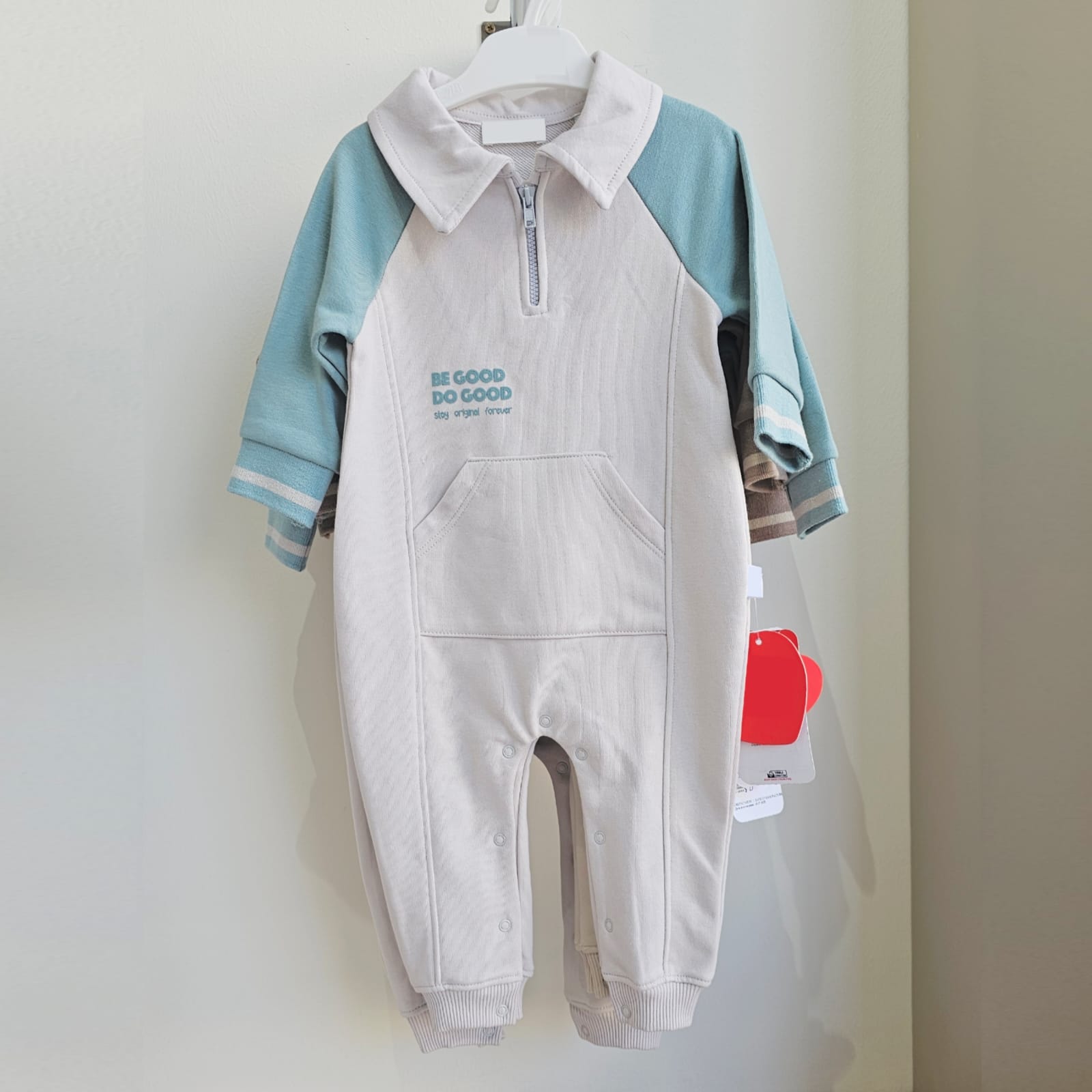 Triple threads Baby romper with polo collar, front zipper, mint raglan sleeves, and “Do Good” embroidery. Features front kangaroo pocket, snap buttons at the legs, and soft cotton fabric for all-day comfort.