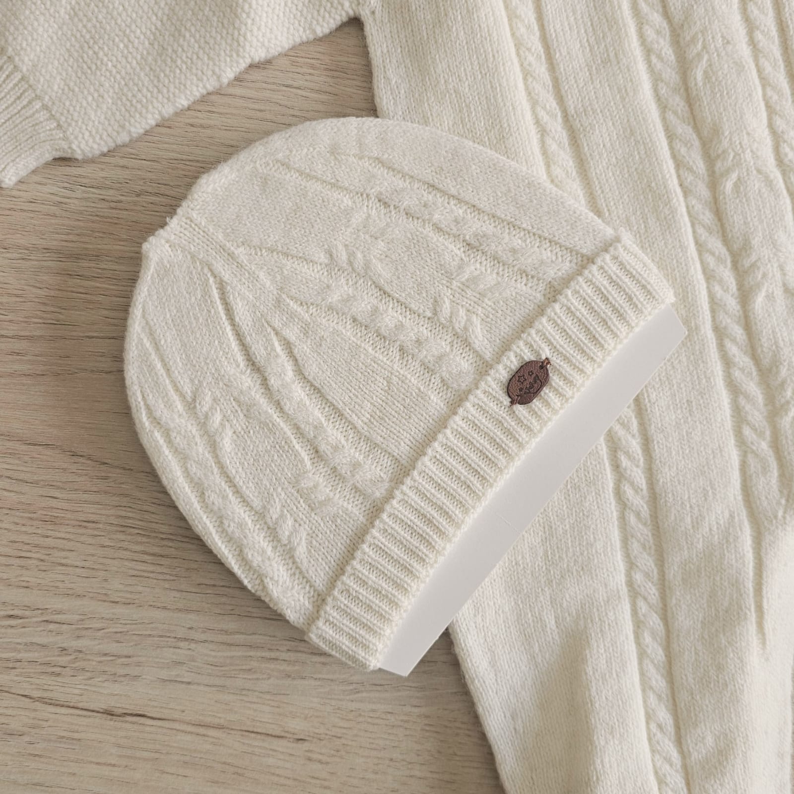 A timeless and cozy 3-piece baby set perfect for cooler days. It includes a soft cream natural wool knitted romper with delicate cable details and wooden buttons, a matching hat for extra warmth, and a smooth white cotton inner overall with a Peter Pan collar. Designed for comfort and elegance, this outfit keeps your little one snug and stylish from head to toe — ideal for outings, special occasions, or as a thoughtful gift.