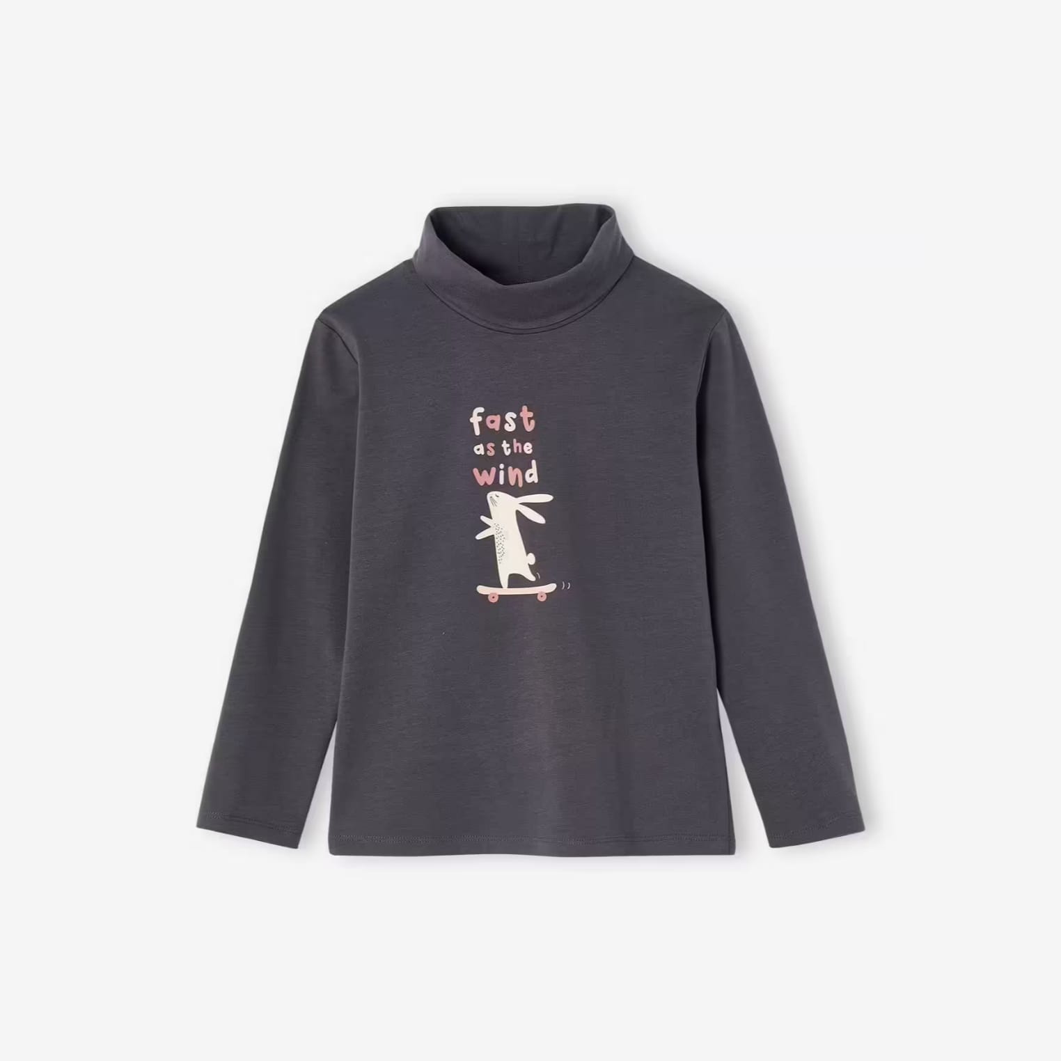This adorable turtleneck is a must-have for your little one’s winter wardrobe. Designed in soft, breathable cotton, this long-sleeve top combines comfort with playful style , this charcoal top with a fun bunny on a skateboard print and the phrase “fast as the wind” for a sporty, cheerful vibe ,perfect for layering under sweaters, jackets, or wearing on their own, this turtleneck keep your child warm and stylish all season long.