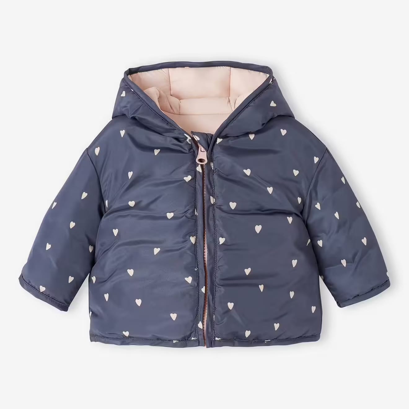 Keep your little one cozy and stylish with this adorable reversible puffer jacket. Double-sided for versatile looks, one side features a soft blush pink finish while the other showcases a navy blue design adorned with sweet heart prints. Made in France with attention to detail, this padded jacket ensures warmth and comfort, while the zip-up front and attached hood provide full protection against chilly weather. Perfect for winter outings, it combines practicality, quality, and cuteness in one essential piece for your baby’s cold-weather wardrobe.