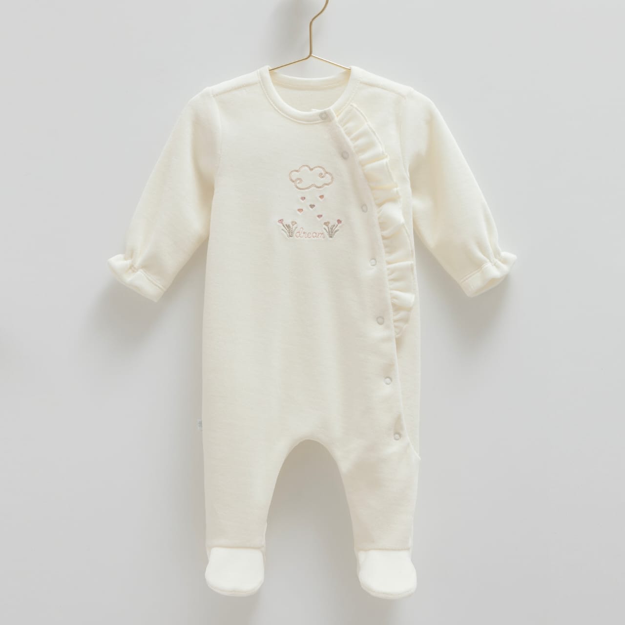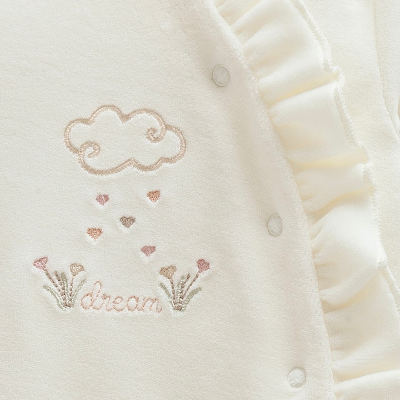 This cozy cream baby velour sleepsuit combines comfort and charm in one adorable piece. Made from soft, comfy velour, it keeps your little one warm and gentle on delicate skin. The design features a sweet embroidered cloud with raindrop details and the word “dream,” adding a touch of cuteness. A soft ruffle runs along the snap-button closure for easy dressing and diaper changes. With built-in footies and long sleeves, this sleepsuit is perfect for newborns and infants during cooler days and peaceful nights.