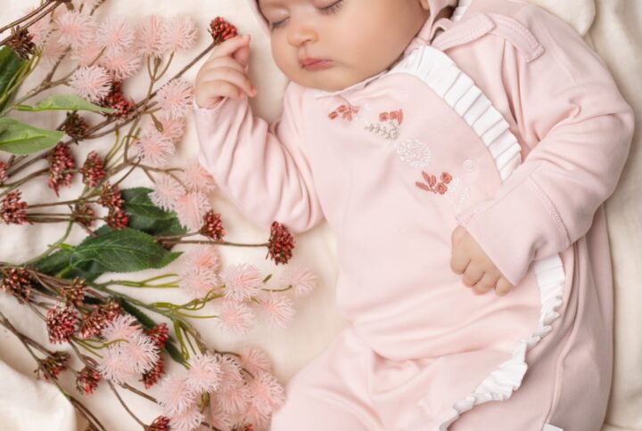 Blush Pink Ruffle-Trimmed Baby Sleepsuit with Floral Embroidery