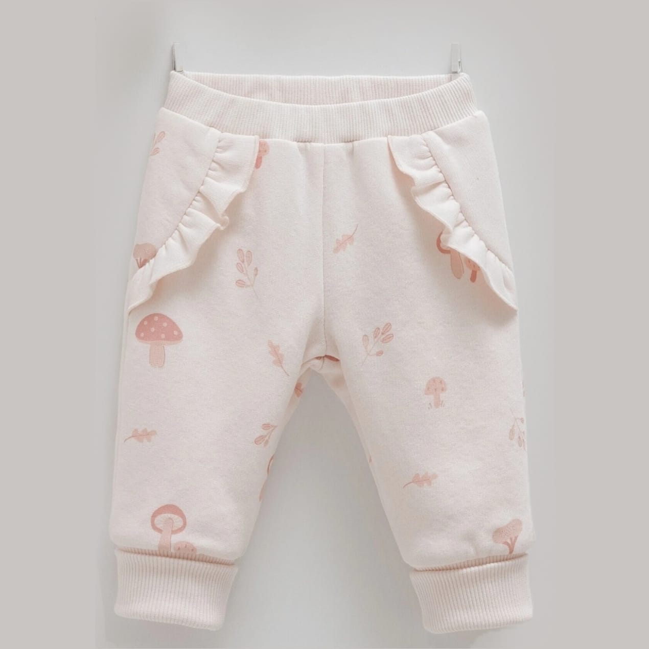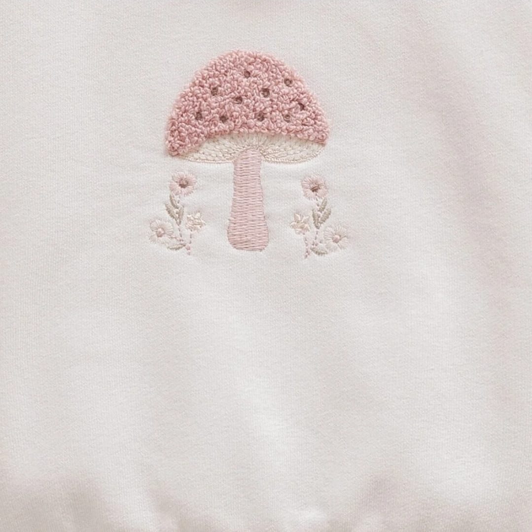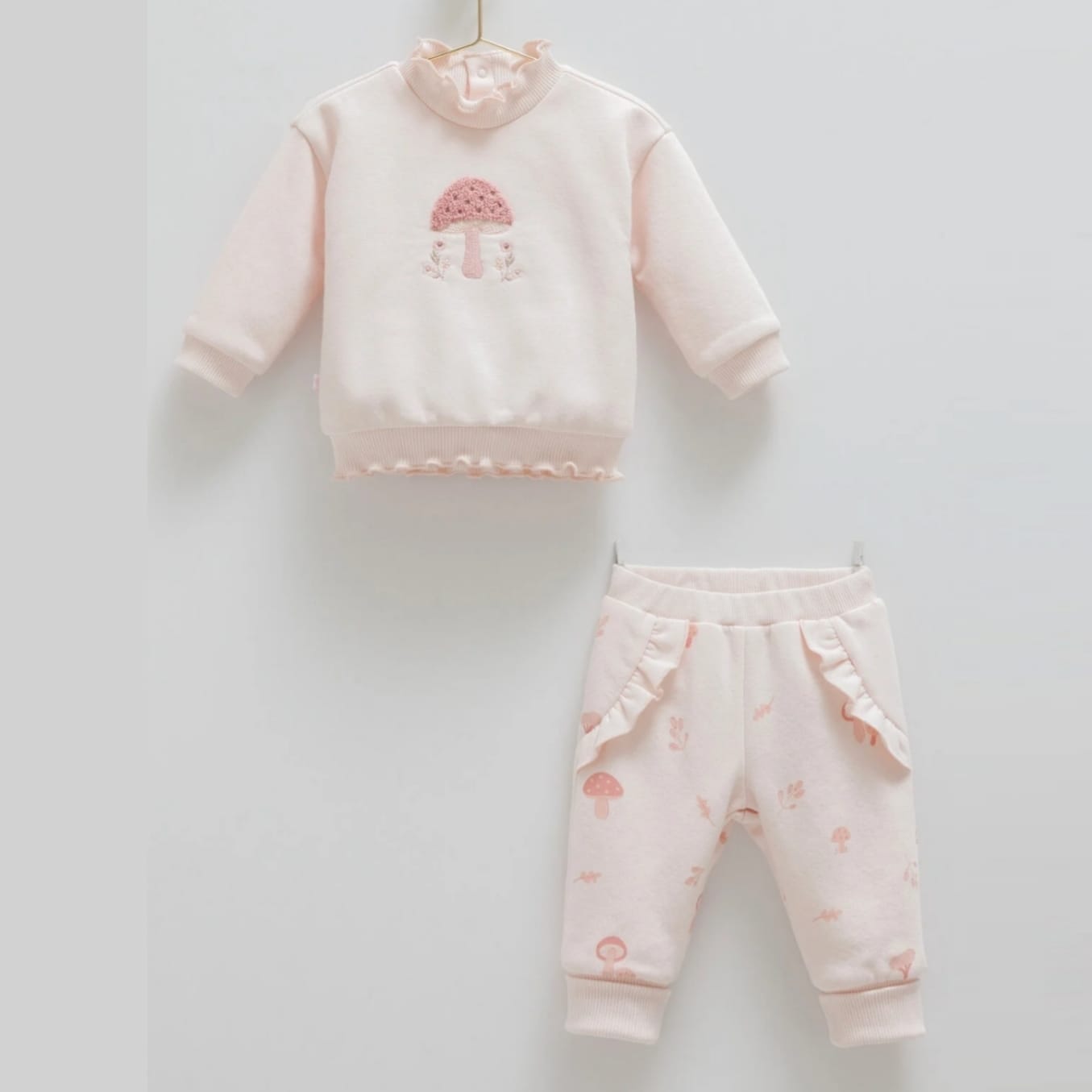 This adorable baby girl set includes a soft blush pink fleeced sweatshirt with a cute mushroom embroidery and delicate ruffle trims, paired with matching fleeced joggers featuring subtle mushroom prints and frilled side pockets.