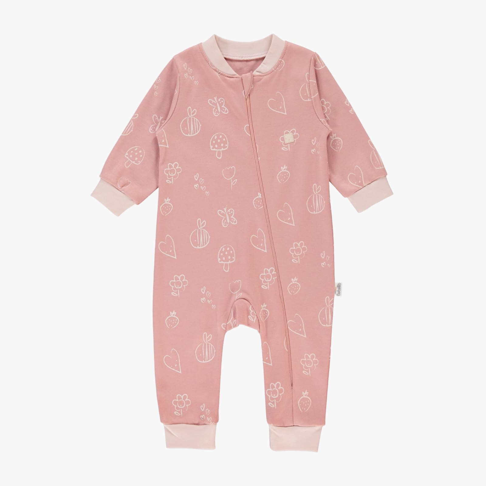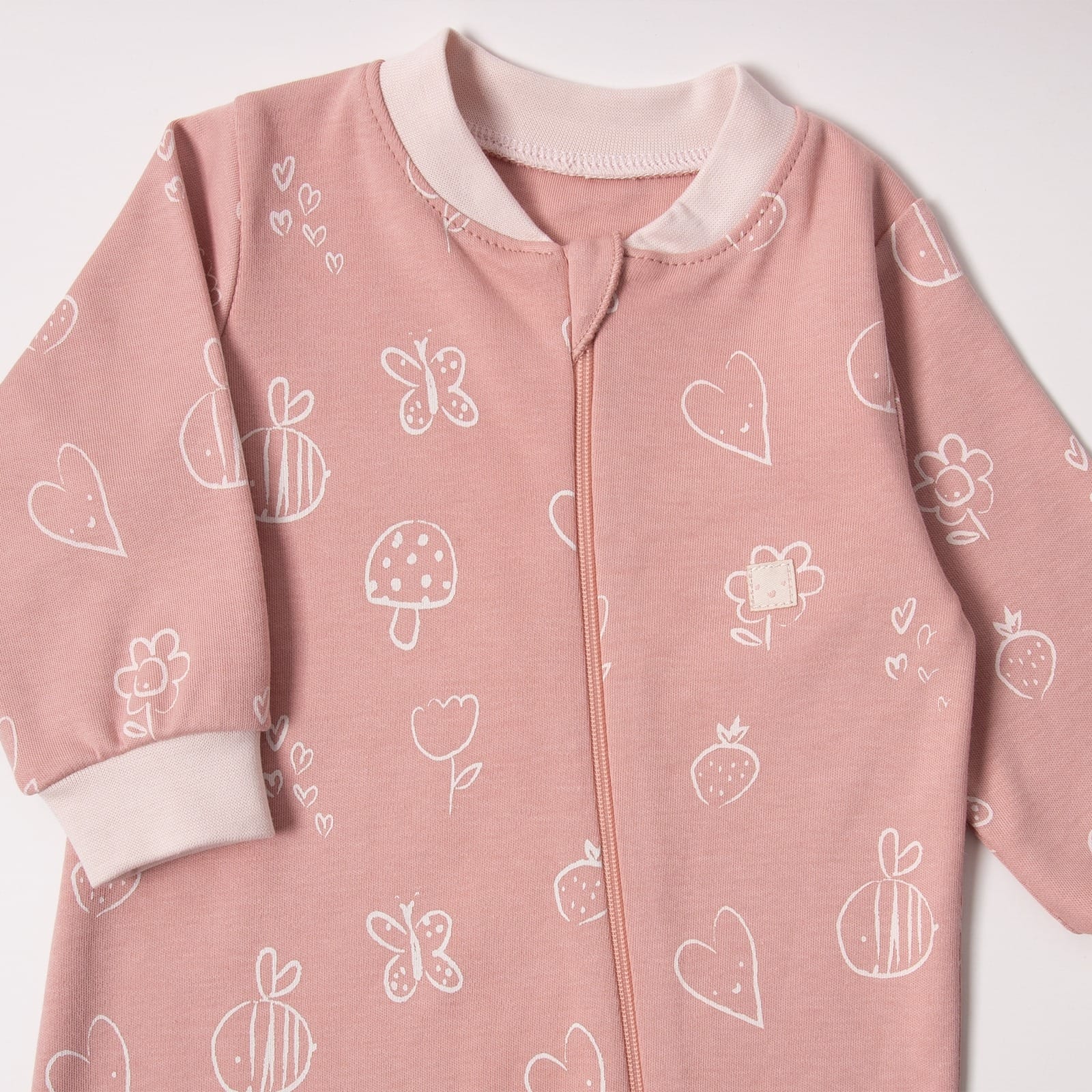 Keep your little one cozy and stylish with this pink romper, designed with adorable all-over prints of hearts, flowers, butterflies, and fruits. Made from breathable cotton fabric, open feet, and a practical front zipper for easy dressing and changing. Perfect for everyday wear, this romper combines comfort with a sweet playful look.