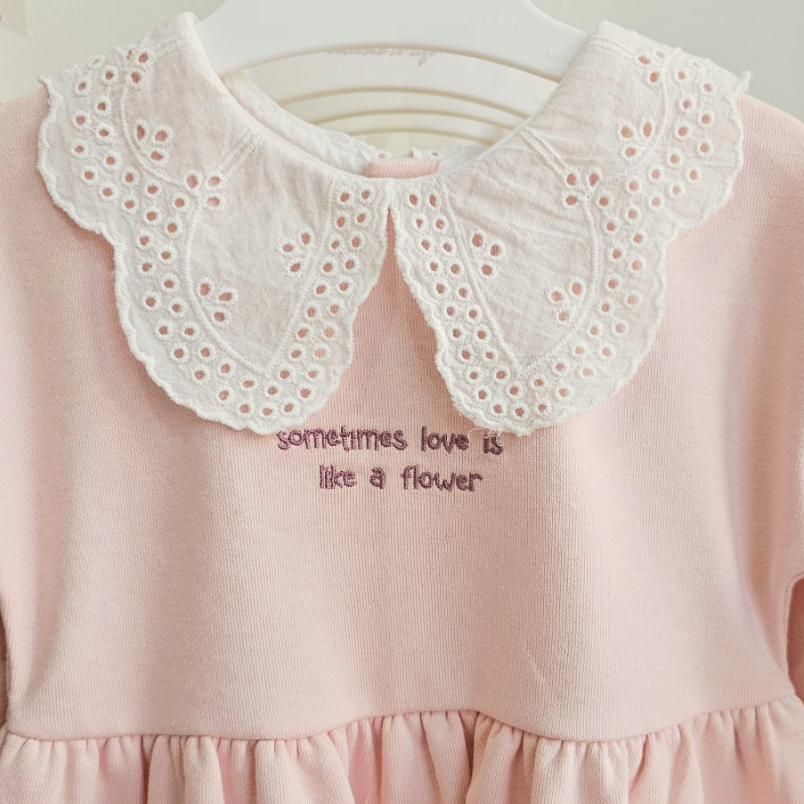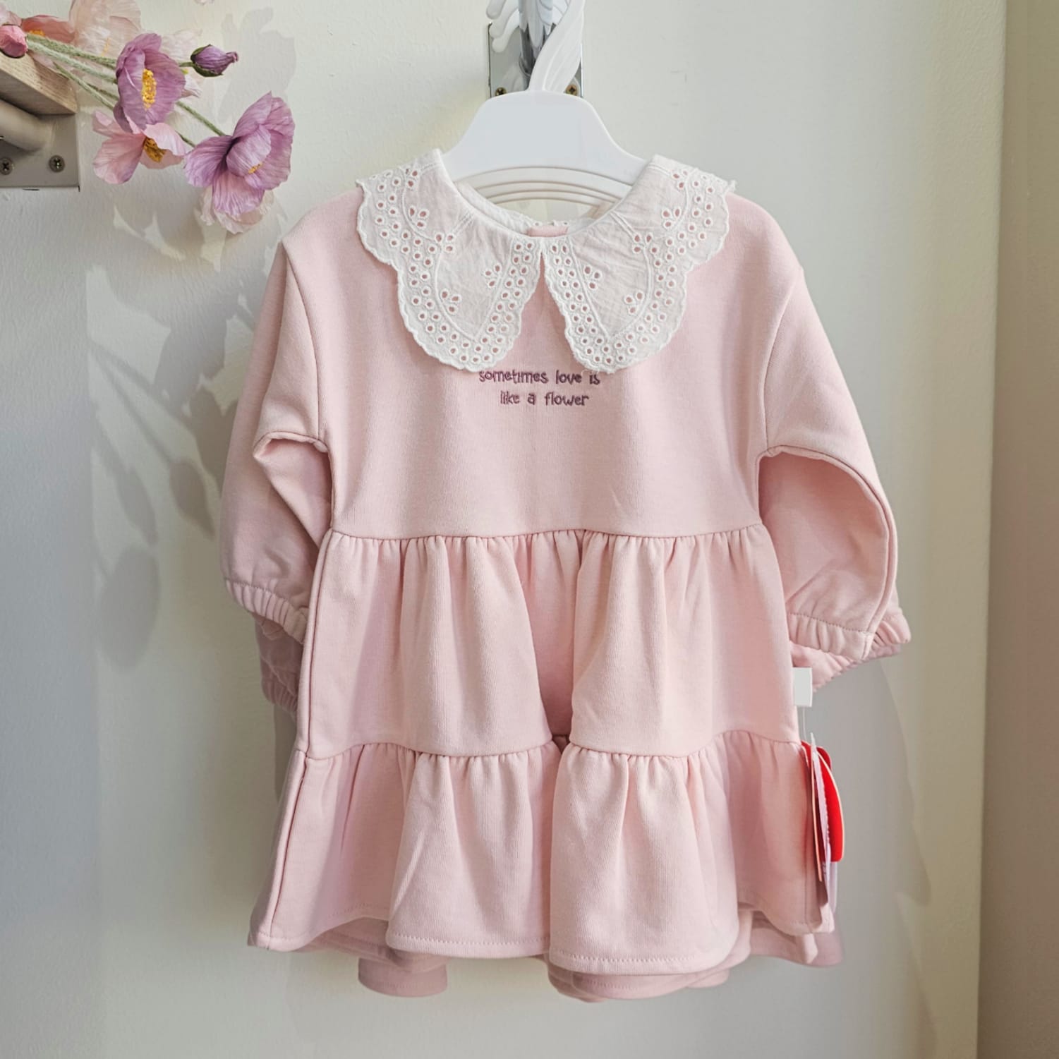 A charming baby girl dress in soft pastel pink, designed with a tiered ruffle skirt for a playful and elegant look. The dress features a delicate white lace collar and sweet embroidery on the chest that reads “sometimes love is like a flower.” With long sleeves and a comfortable fit, this dress is perfect for both everyday wear and special occasions.