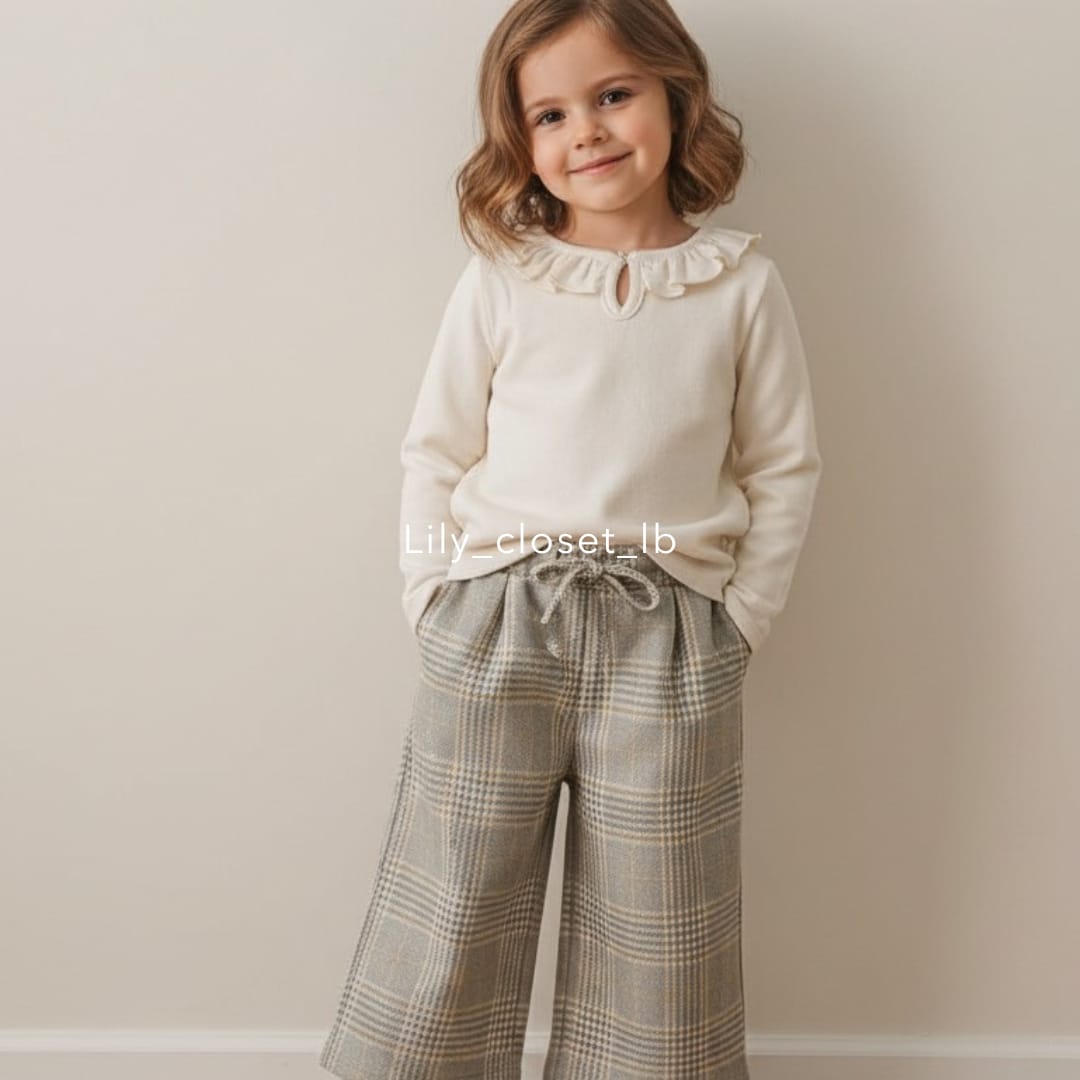 set of ruffled girls ecru blouse & beige plaid pants
