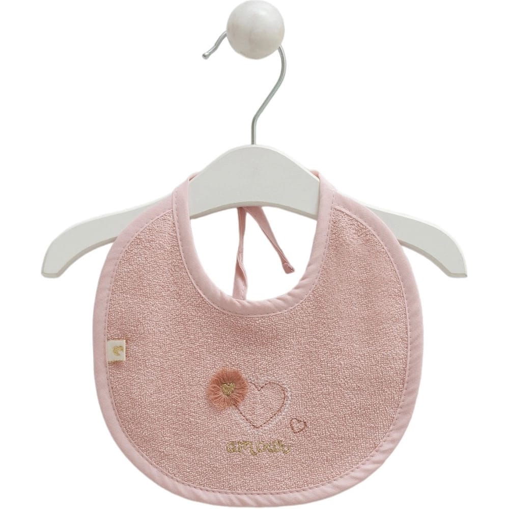 Super soft and absorbent baby bib made from gentle double layered towel fabric. Available in four colors — pink, navy blue, beige, and grey — each with delicate embroidered designs like hearts and rainbows. Perfect for keeping your little one clean in style.