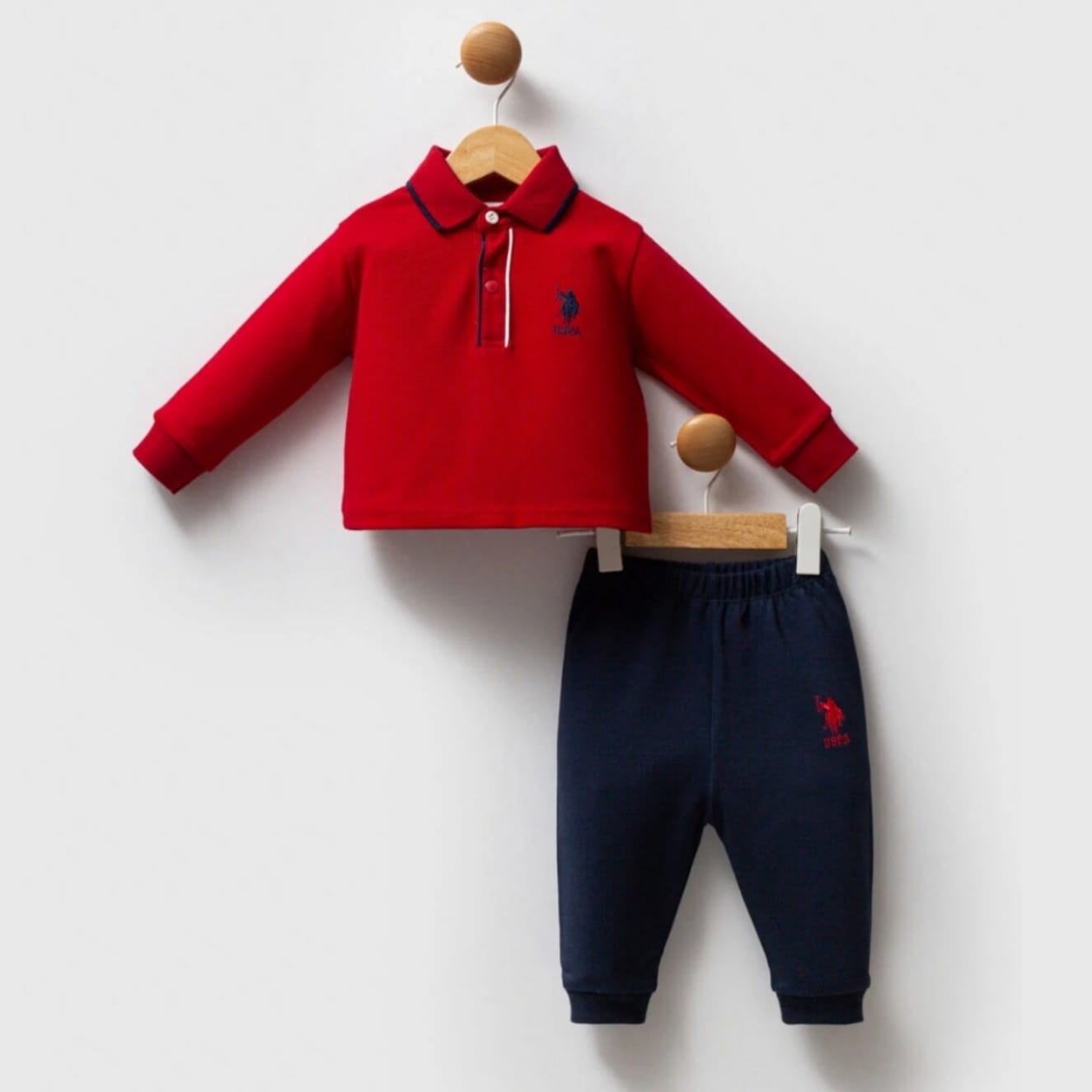 A timeless and elegant outfit designed for comfort and style. This two-piece set includes a red long-sleeve polo top featuring the classic USPA logo and contrast navy trim on the collar, paired with soft navy blue jogger pants with an elastic waistband for easy dressing. Made from high-quality cotton fabric to ensure a gentle touch on your baby’s skin and freedom of movement. Perfect for everyday wear, family outings, or casual gatherings with a refined sporty look.